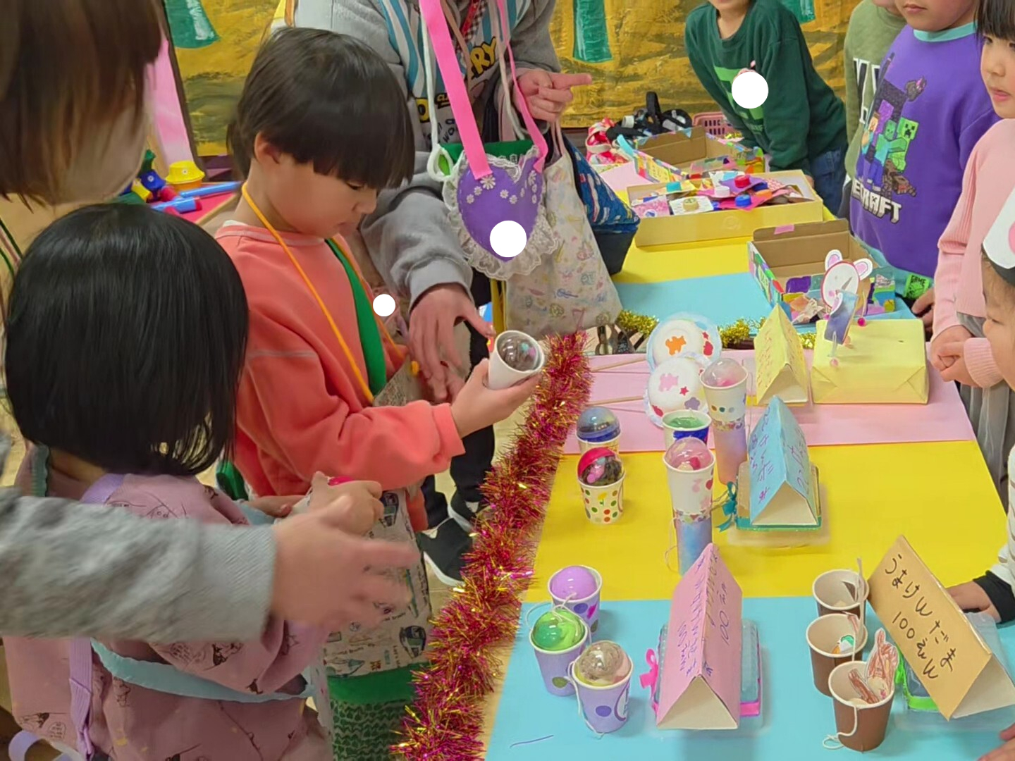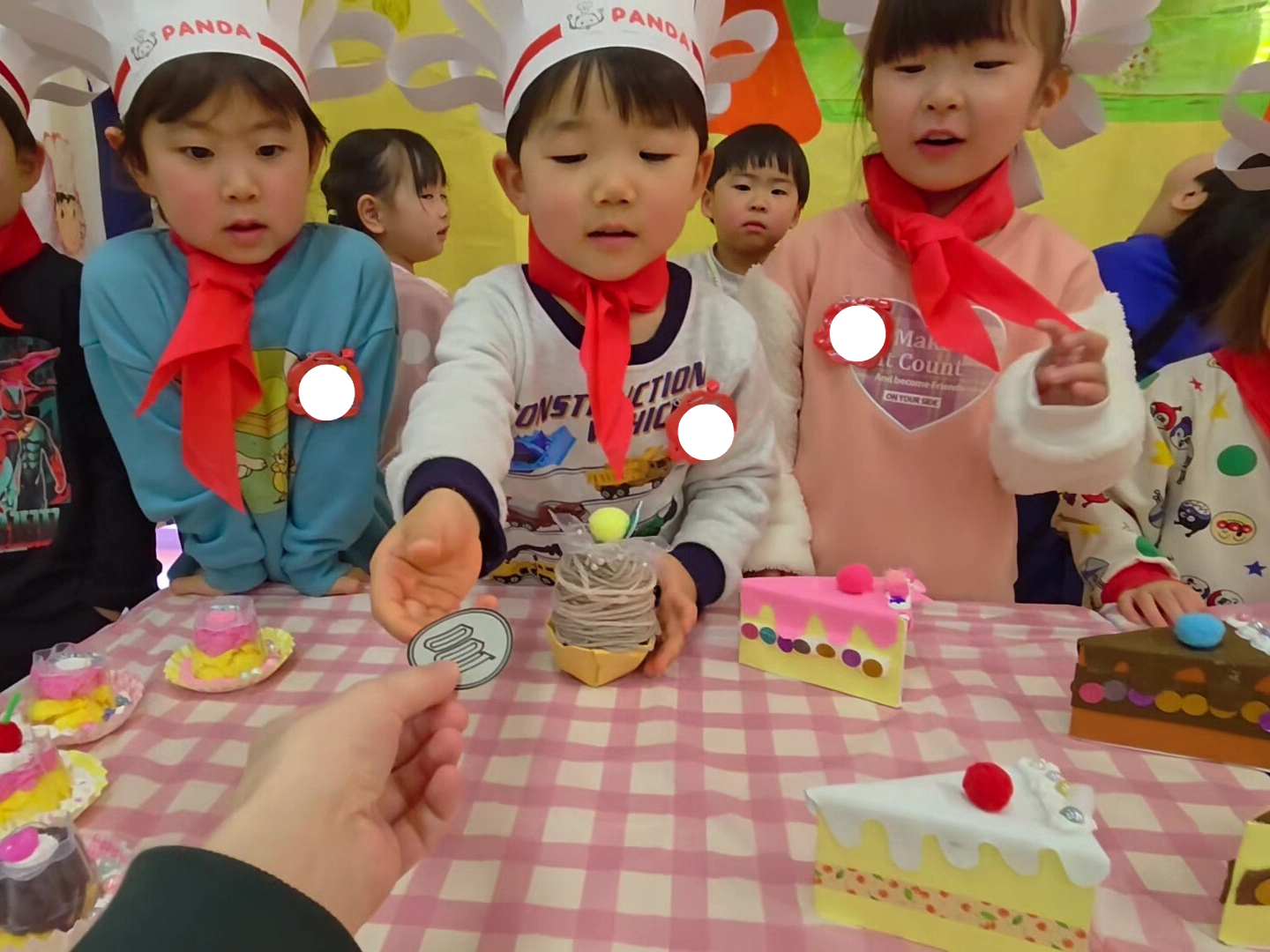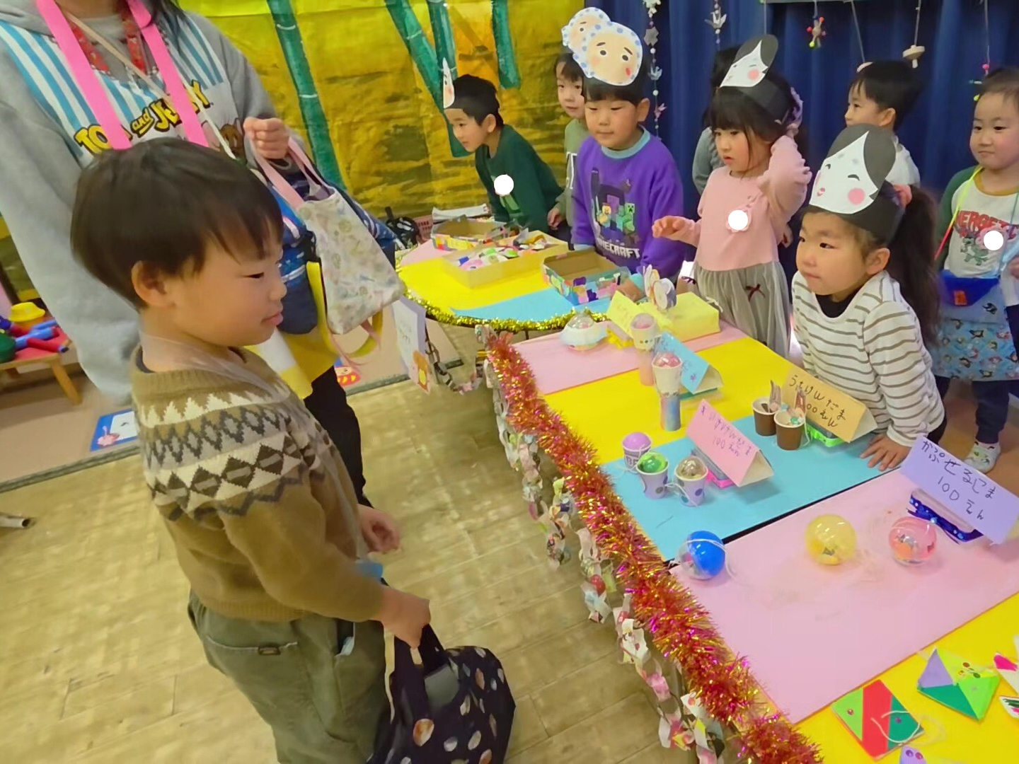 2月6日、9日、10日に作品展がありました。今年のテーマは、「おみせやさん」でした。子ども達は、どんなお店にするか、どんなものを作るかを考え、クレープ屋、駄菓子屋など様々なお店をつくっていきました。当日は、自分で作ったお財布をもち、好きなお店にお買い物へ。年長のお姉さんお兄さんは、戸惑っている年少さんにやさしく声をかけてあげていました。みんなでつくりあげたおみせやさん、素敵な作品展になりました。