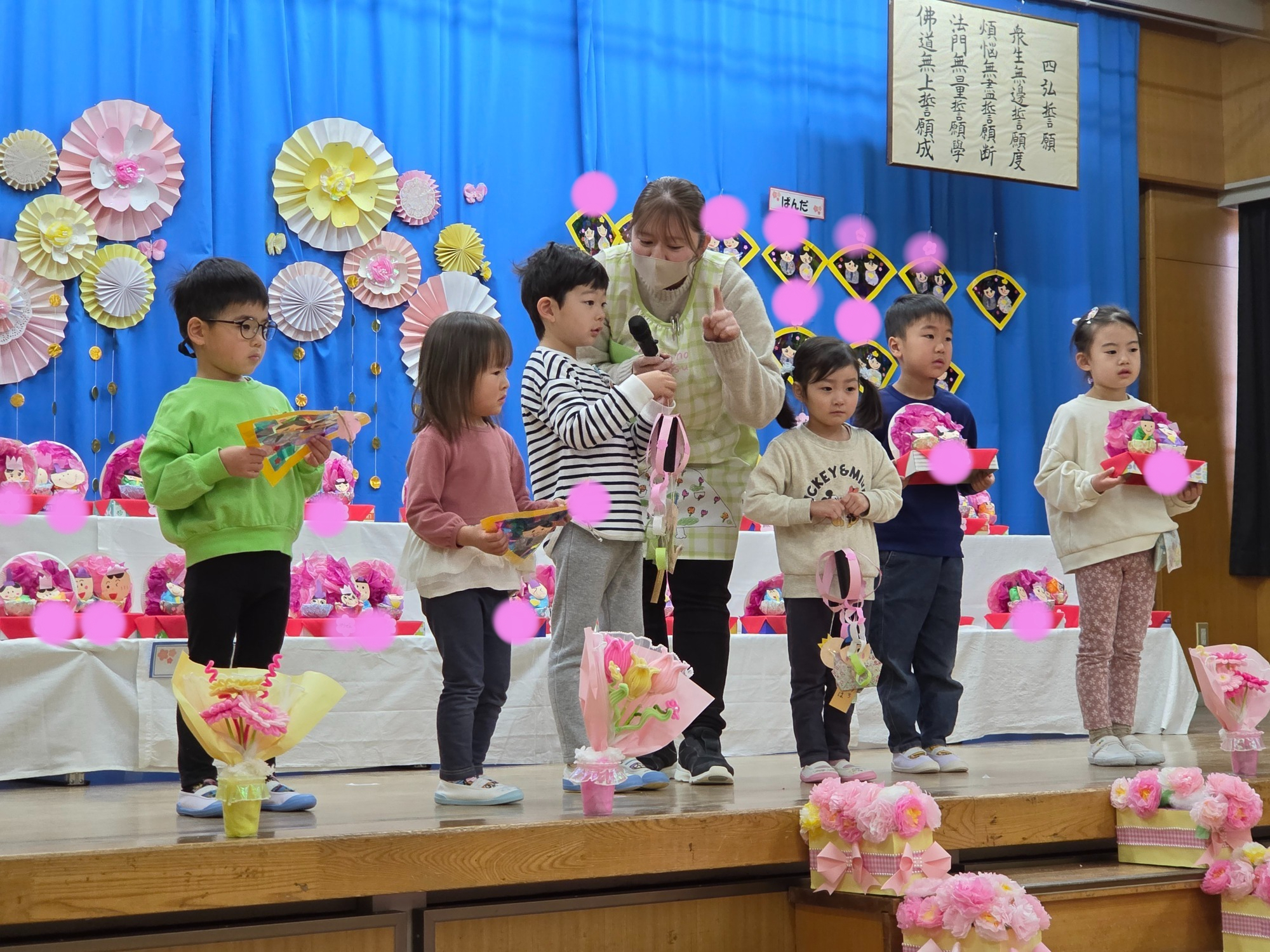 花のアーチをくぐって入場し、年少中児より歌のプレゼント、そして年長さんからもお返しの歌を歌ってもらいました🎼🎶