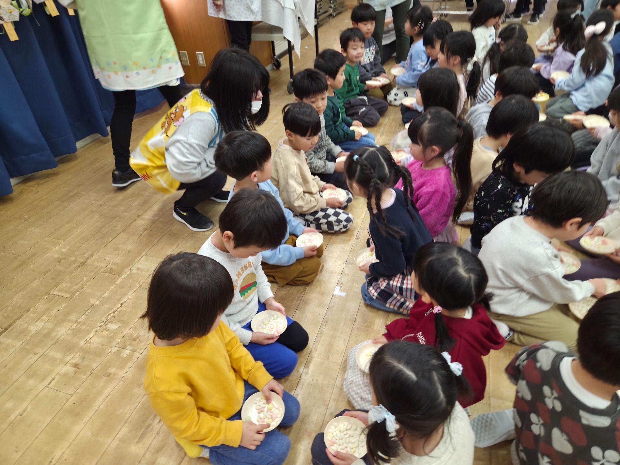 2/3の節分の日、幼稚園でも豆まき会が行われました。自分で作った鬼のお面をつけて、節分についてのお話を聞いたり、豆まきのお歌をうたったりしました!すると突然、幼稚園に鬼がやってきたという放送が…👹💦お部屋に鬼がやってくると、びっくりしながらも一生懸命に新聞紙豆を投げる子どもたち!子どもたちの「おにはそと、ふくはうち」の声に、鬼たちも降参していましたよ😵お給食は節分の特別メニュー🍴自分で好きな色を選んだカラーせんべいに、マカロニやひまわりの種を使ってオリジナルの顔を作りました!焼きそばの髪の毛ととんがりコーンの角でとっても素敵な鬼が完成しました😊特別メニューに子どもたちも大喜びで、おかわりもあっという間に売り切れる程でした!