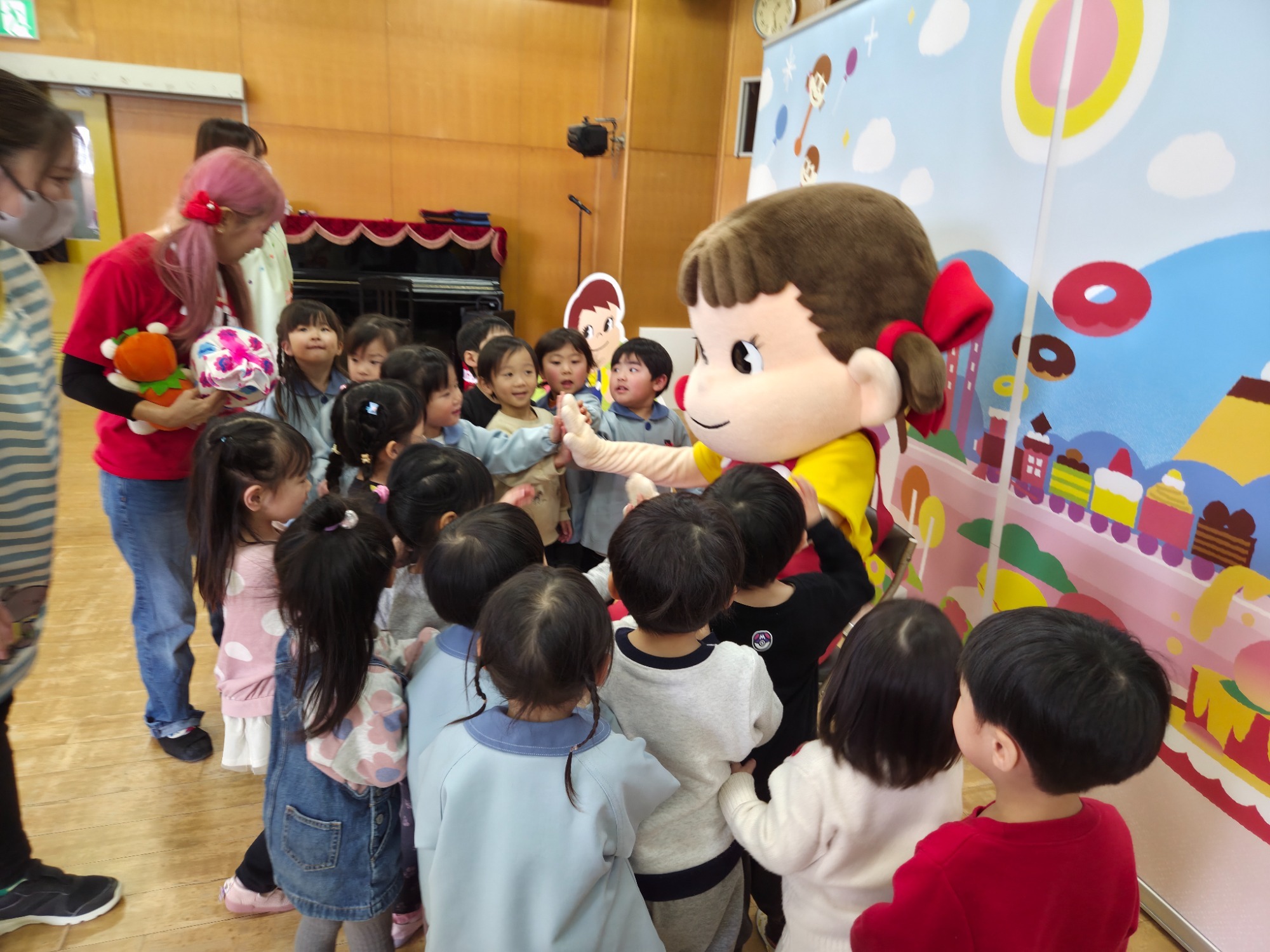 2月17日(火)に、“不二家キャラバン隊”が幼稚園にやってきて、ペコちゃんとお楽しみ会を行いました🎶✨