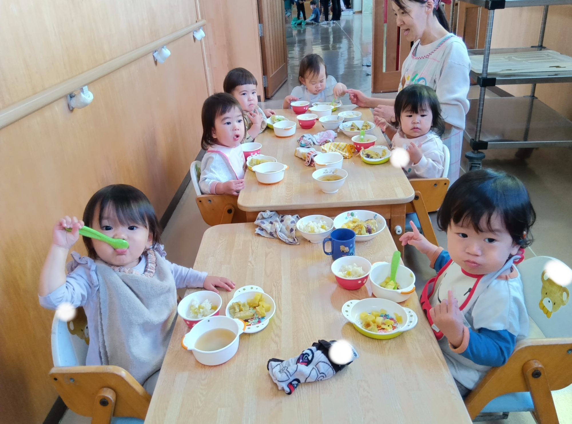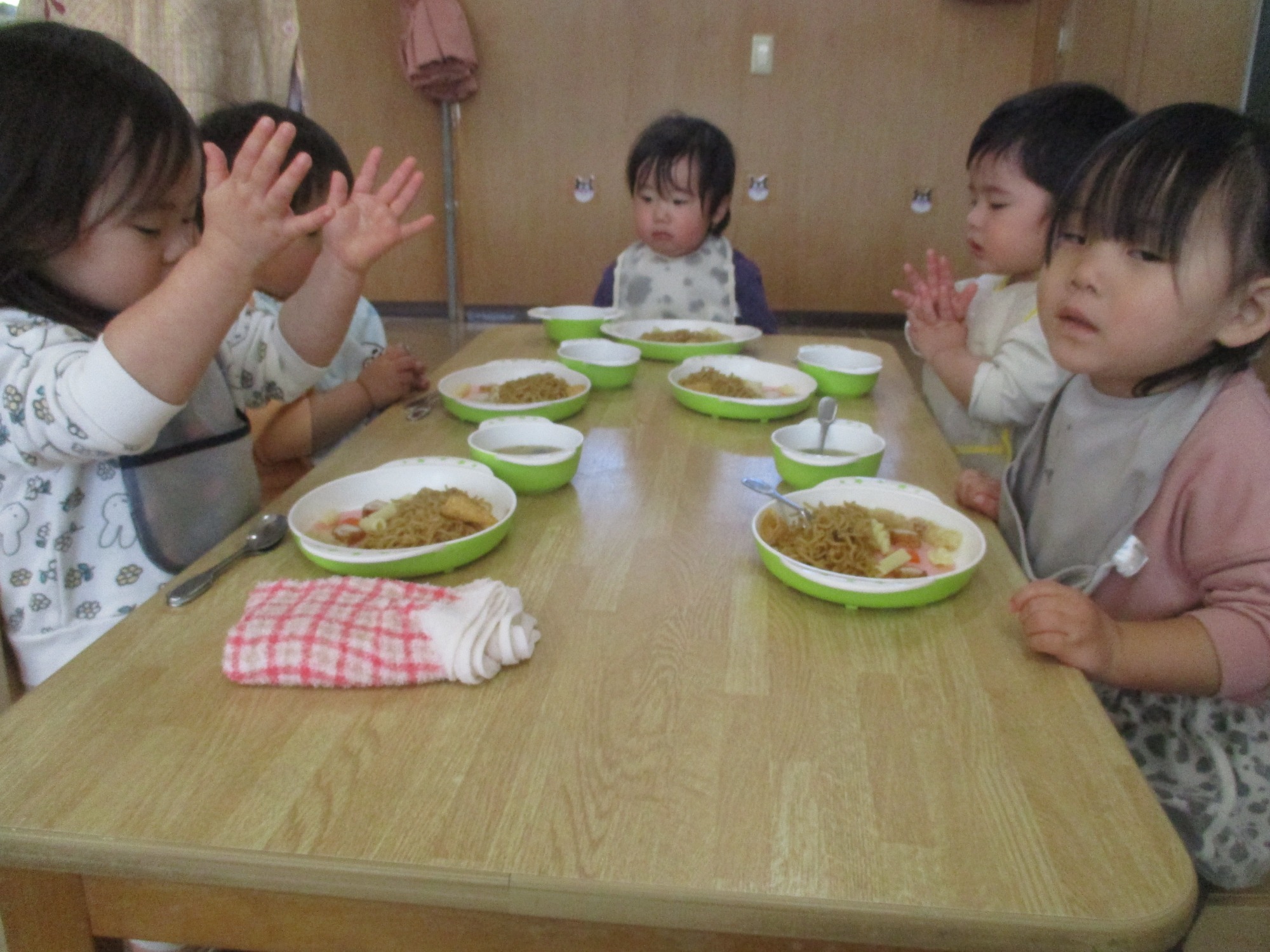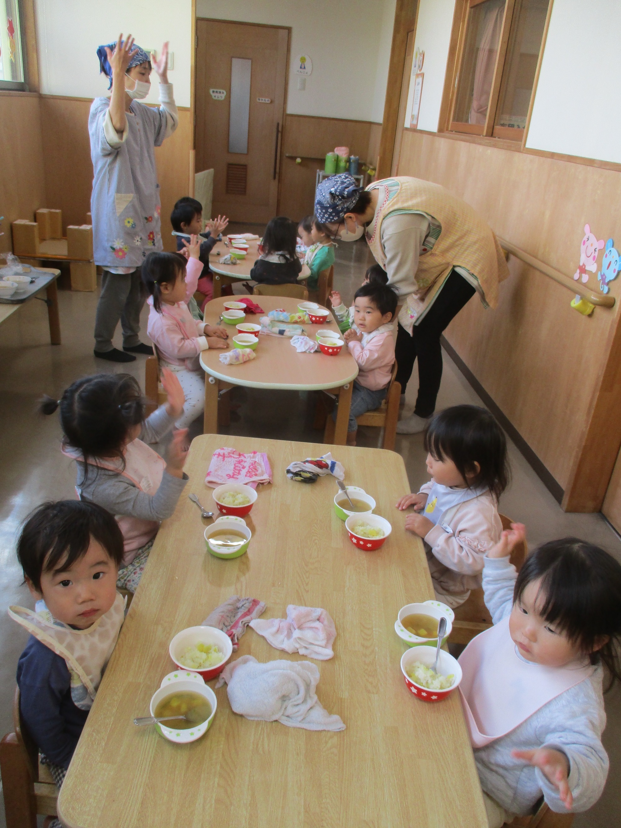 「おいしくなあれ~🎵!」のおまじないをかけ、給食の時間を楽しみに待つ子どもたちでした✨