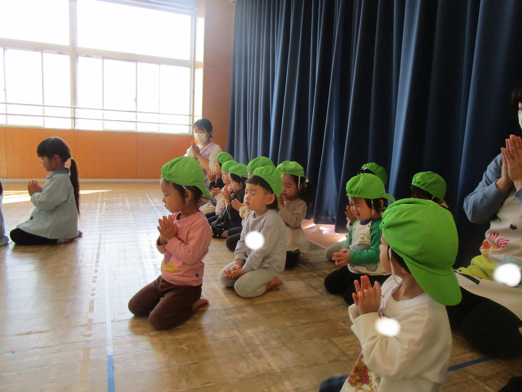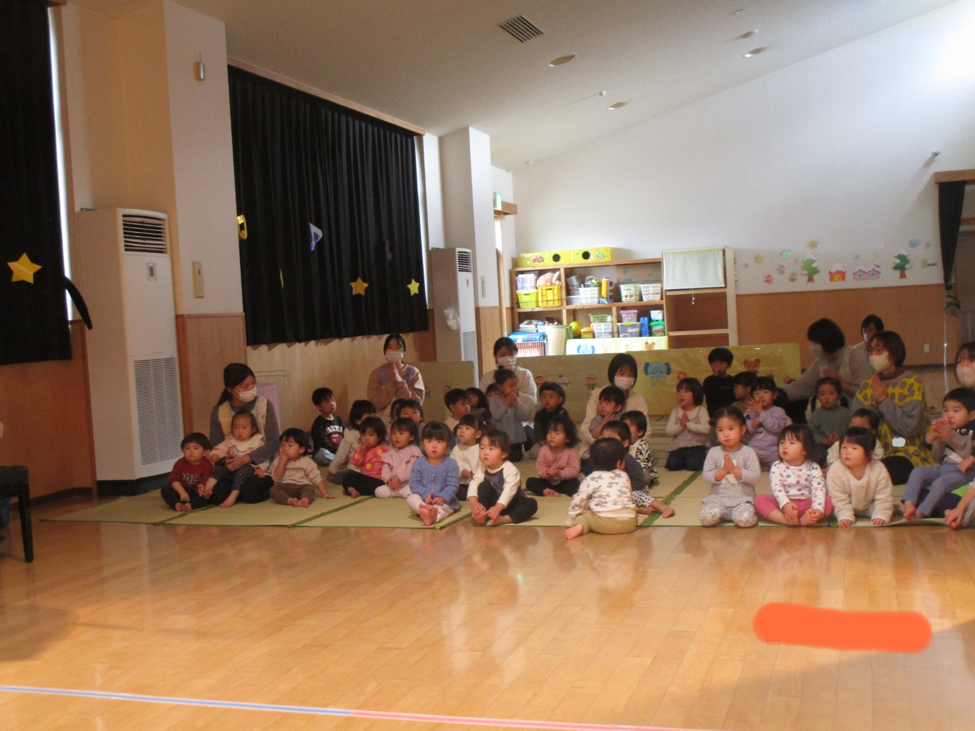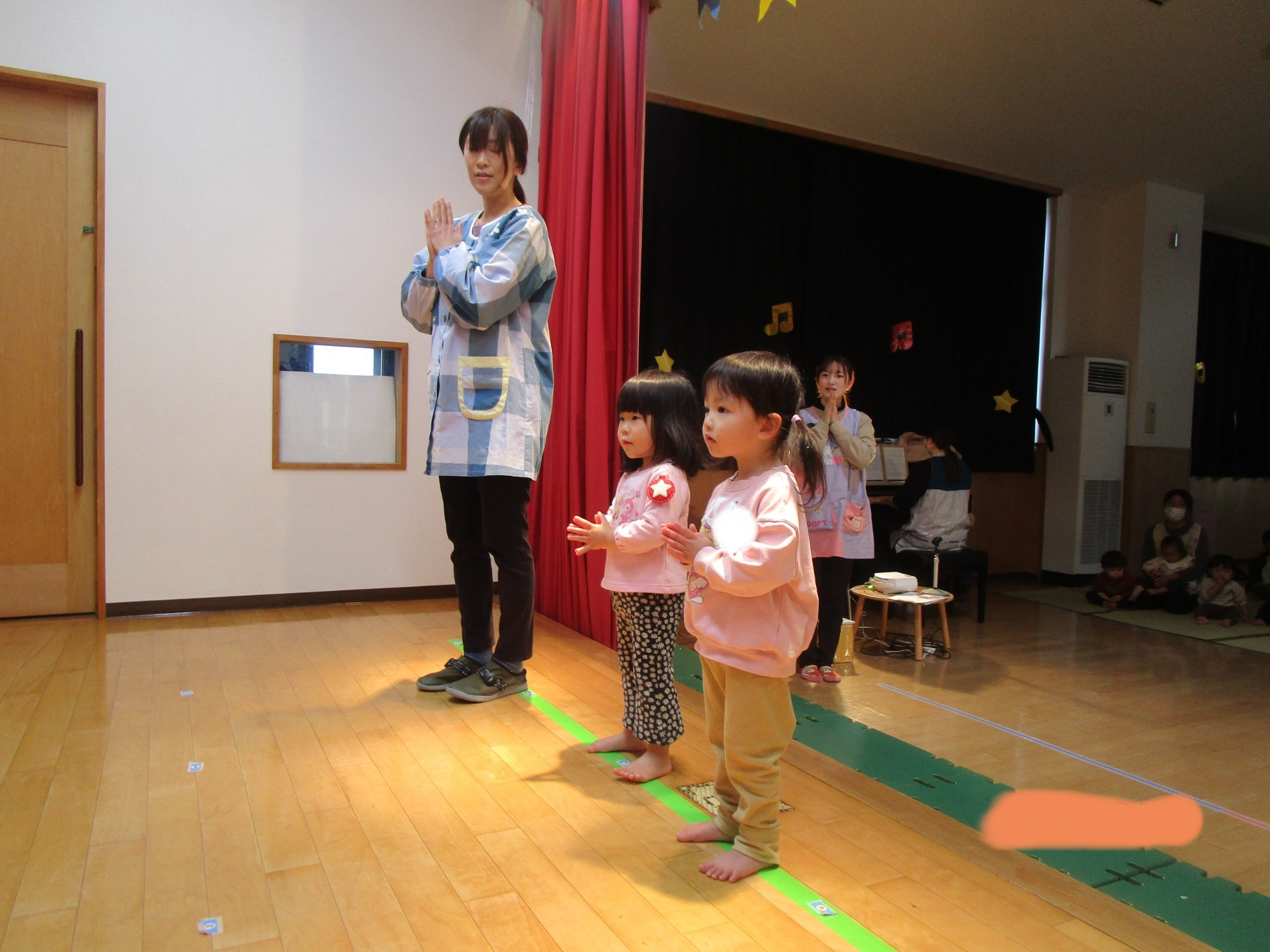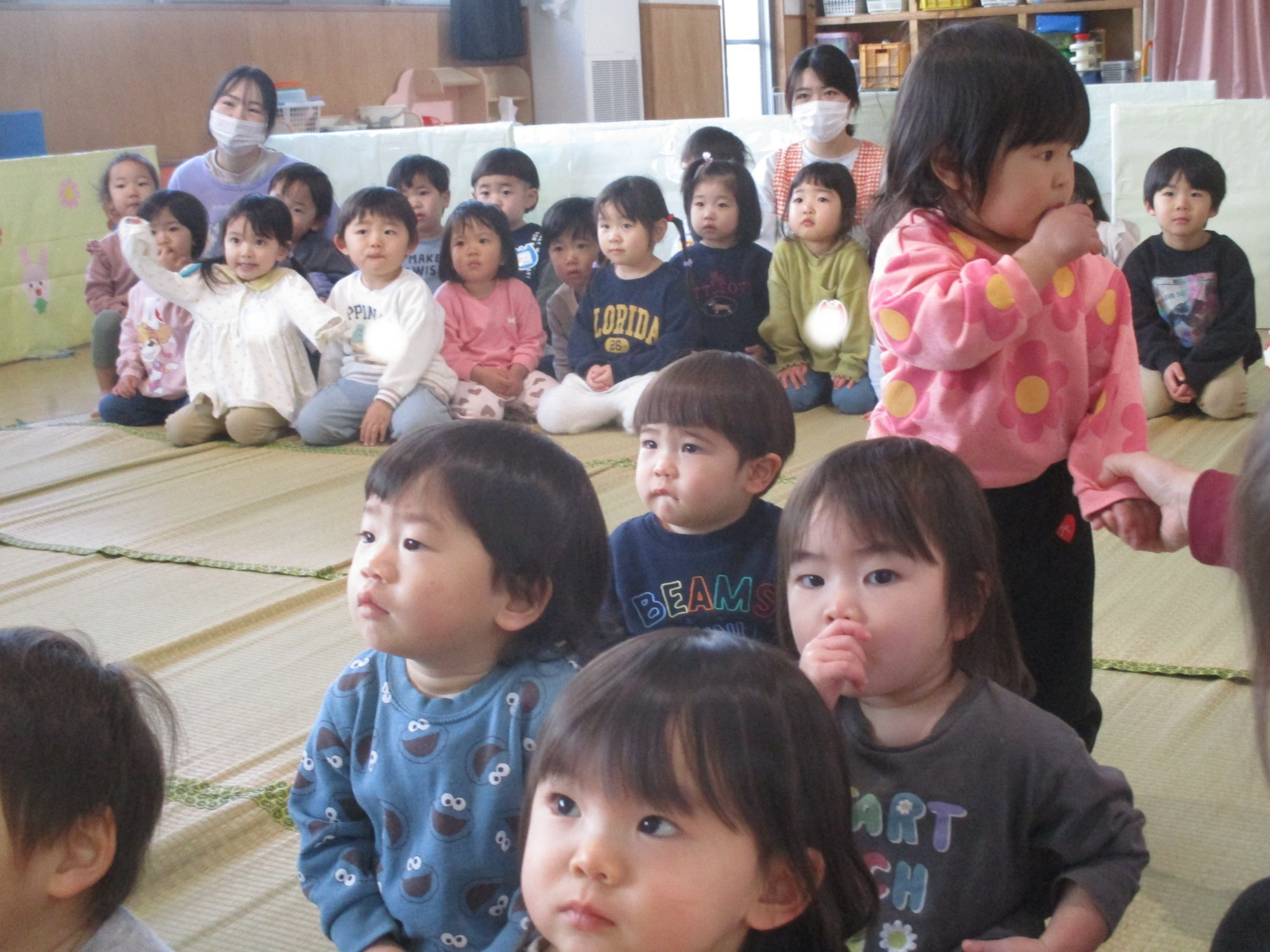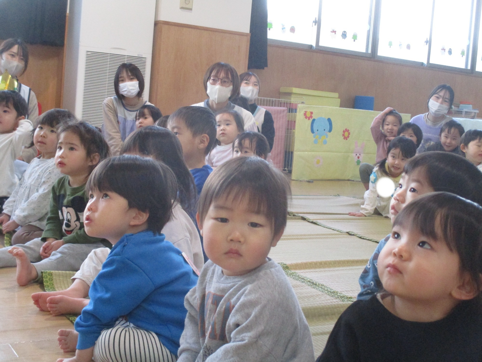 いつもと違う環境に少し戸惑うお友だちもいましたが、朝の会が始まると歌に合わせて手をたたいたり、ご挨拶したりと