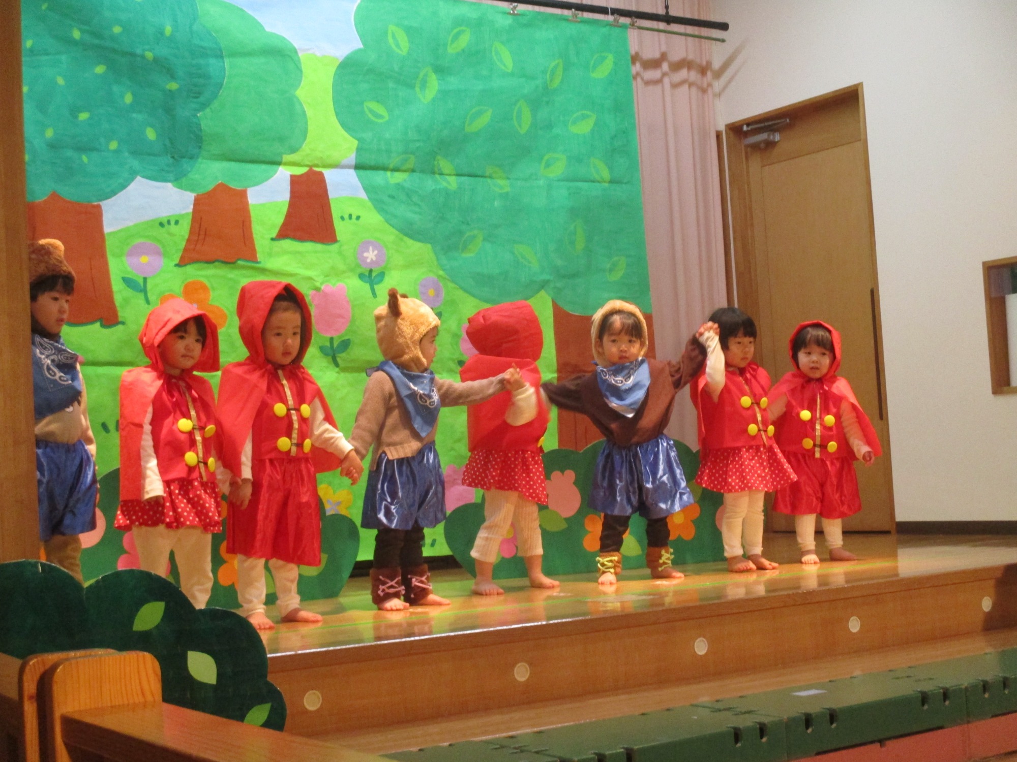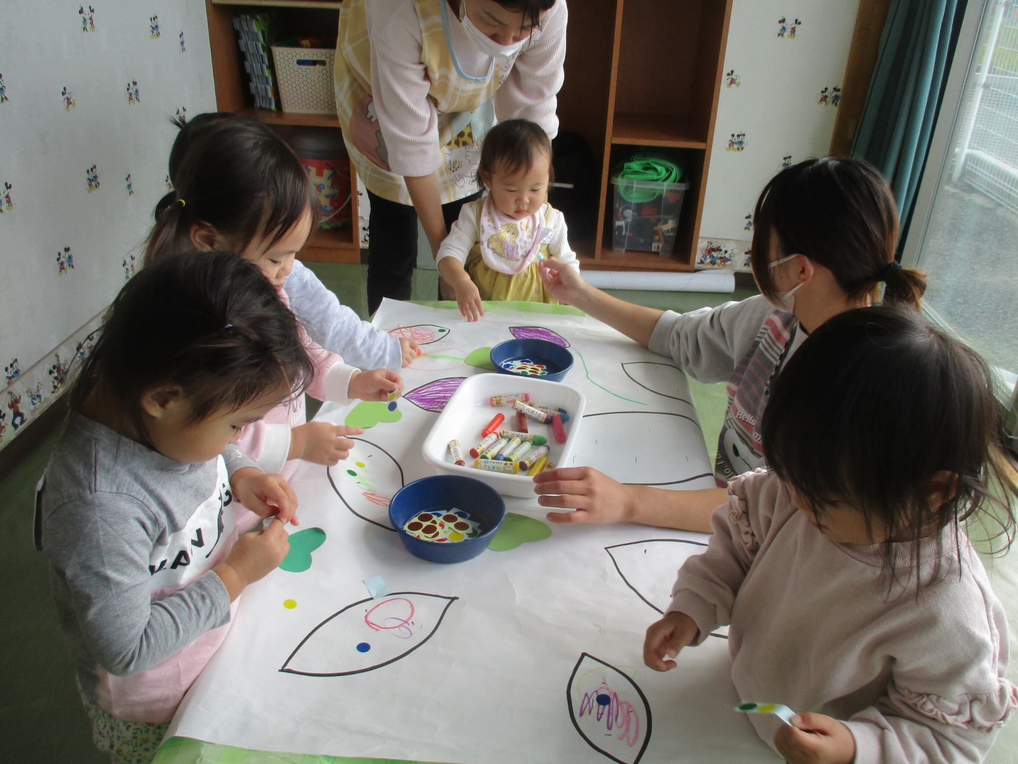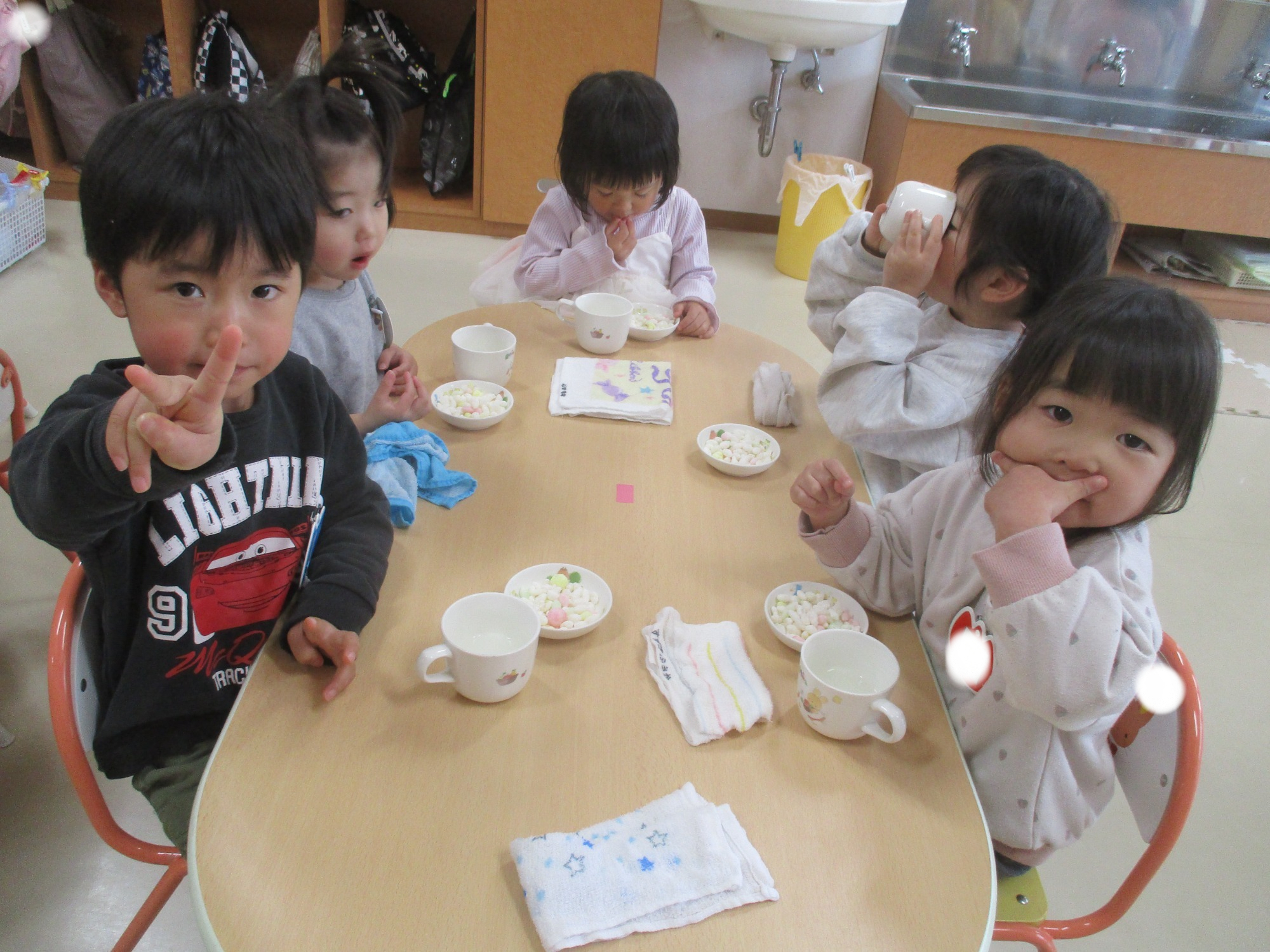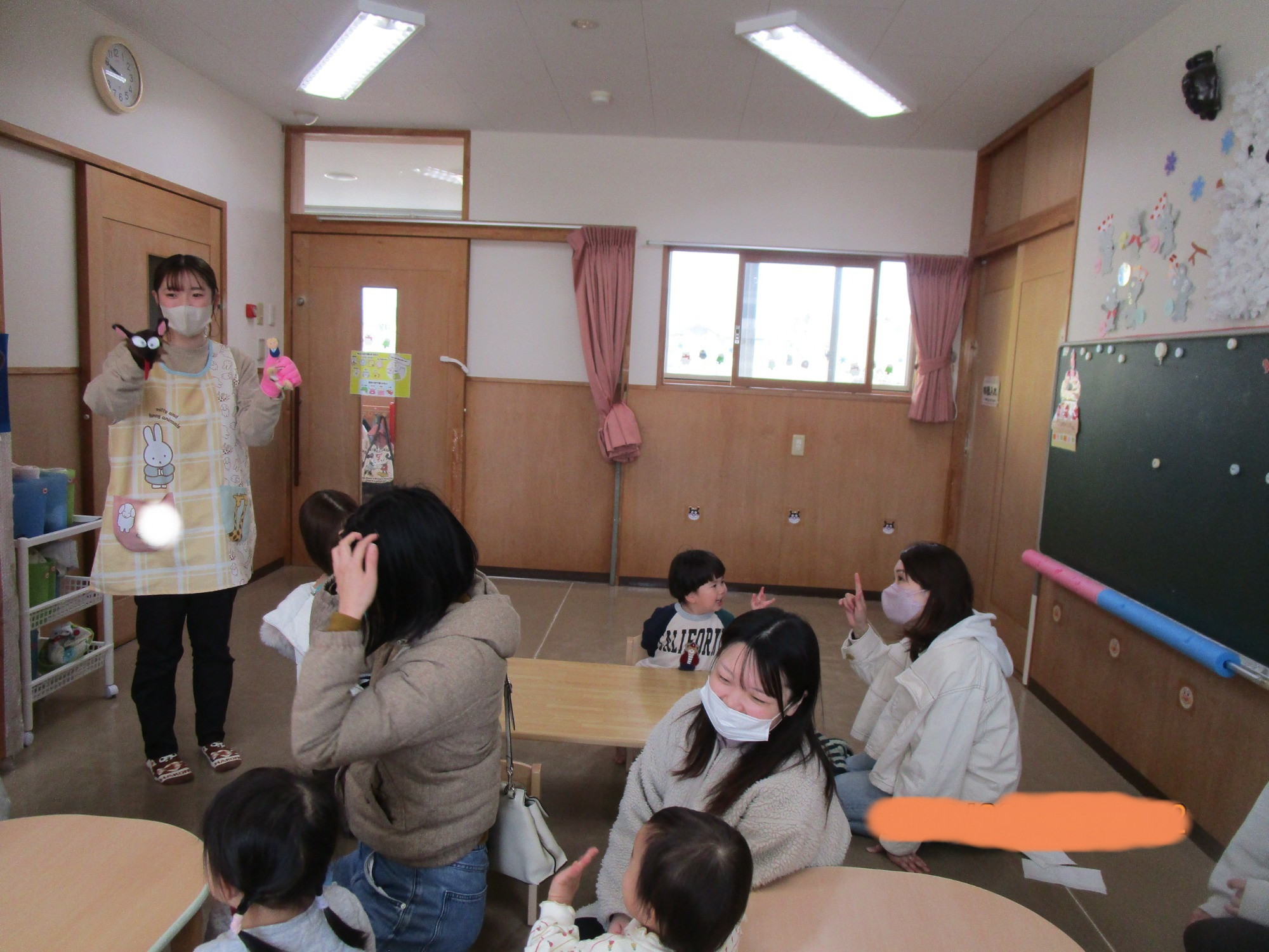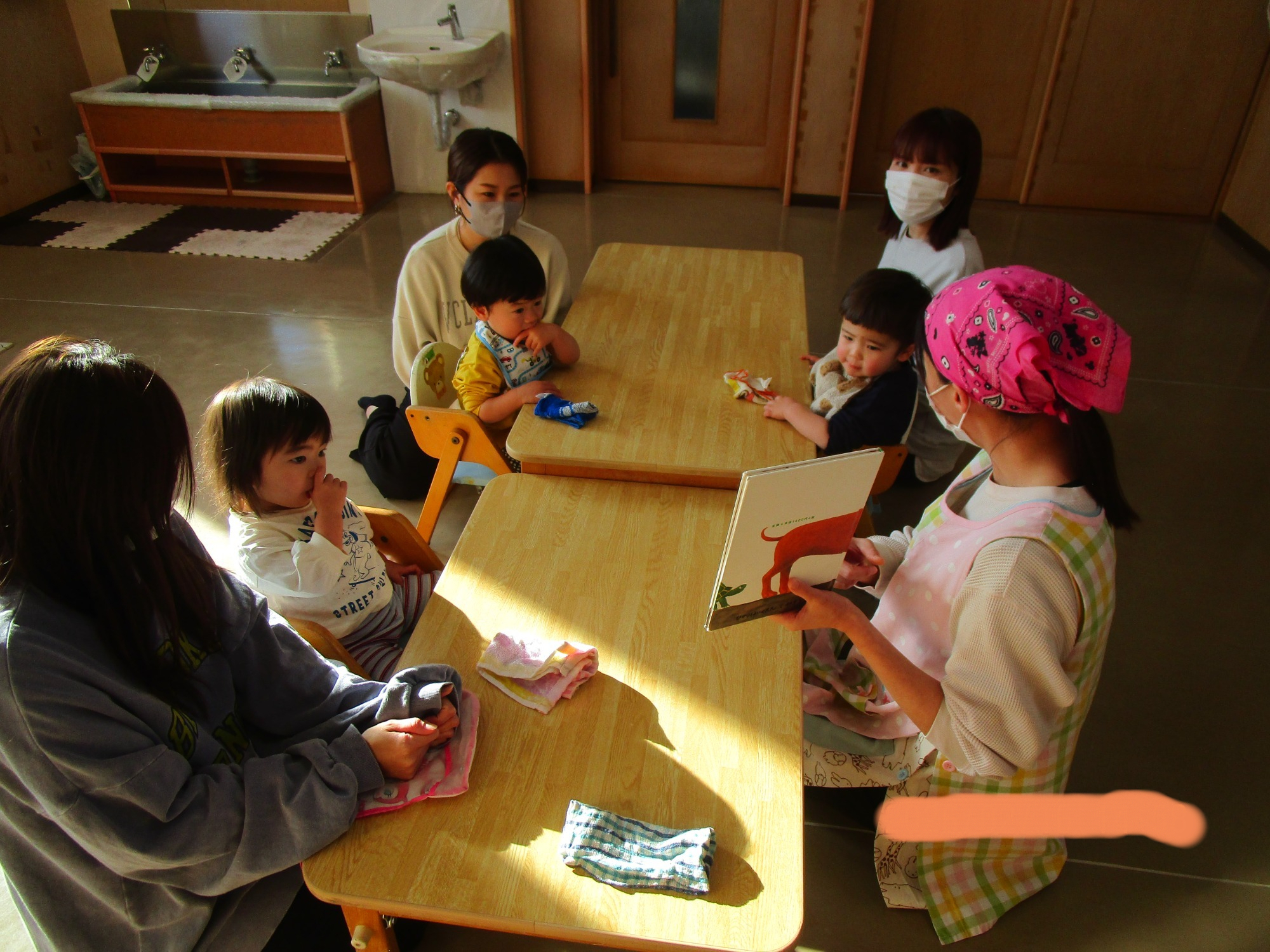 いつもと違う環境に少し戸惑うお友だちもいましたが、朝の会が始まると歌に合わせて手をたたいたり、ご挨拶したりと