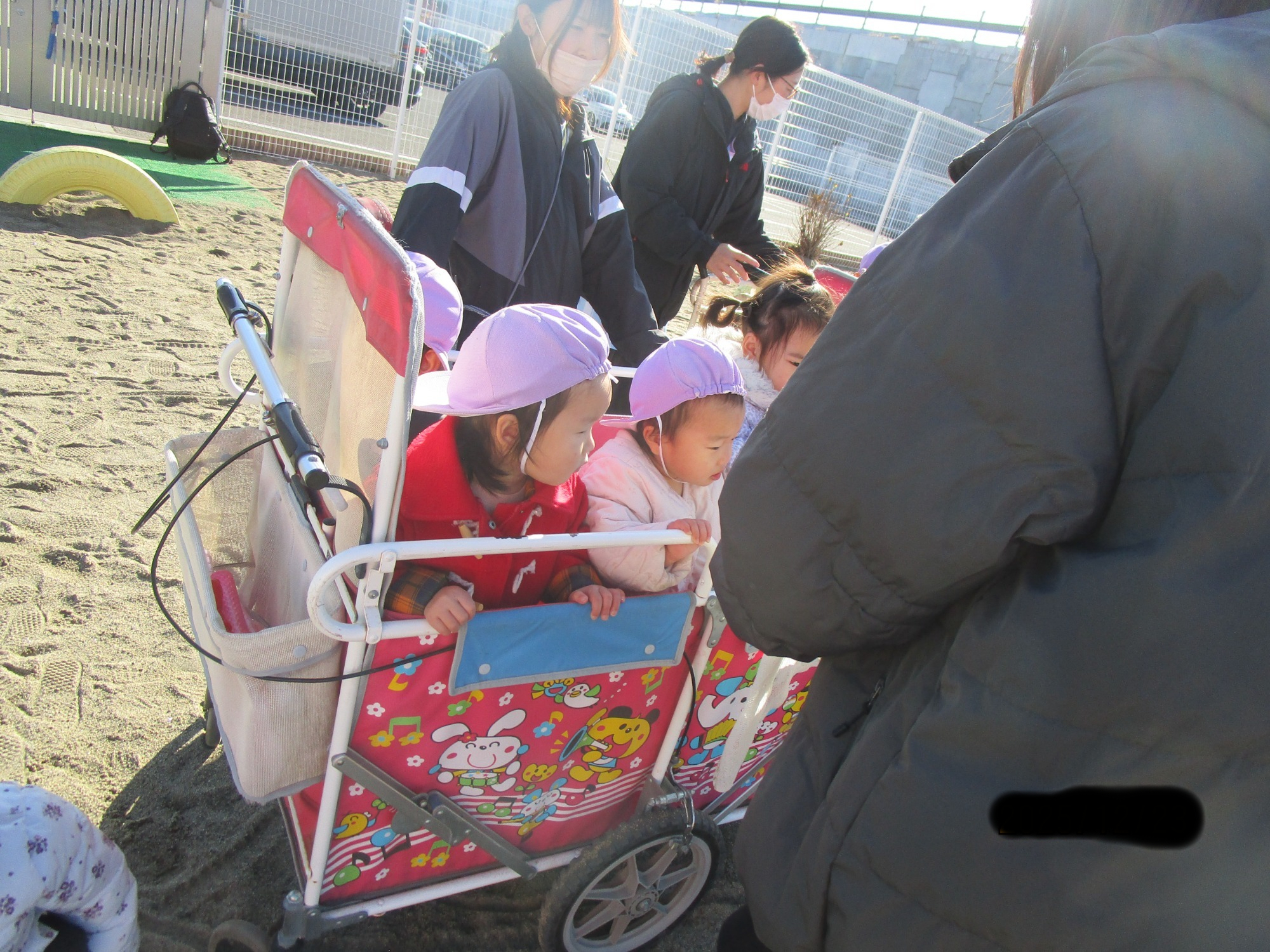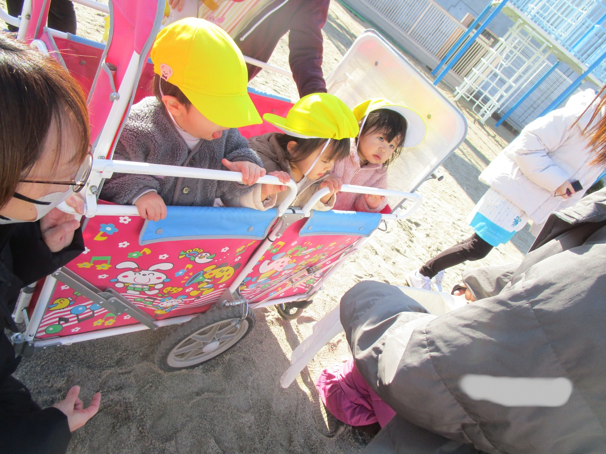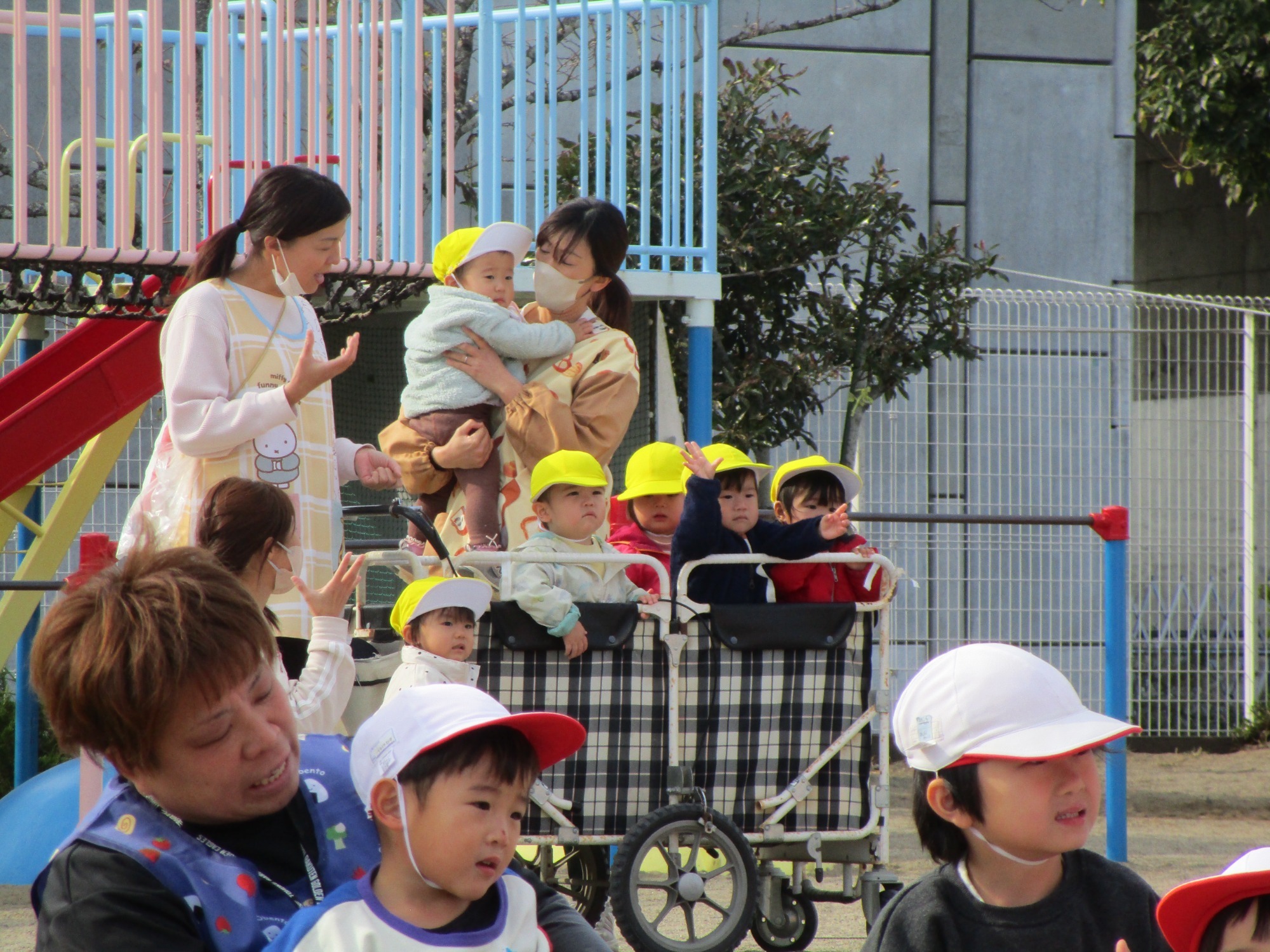 散歩車に乗ってお散歩し、その後初めて幼稚園の園庭で遊んできました✨😊