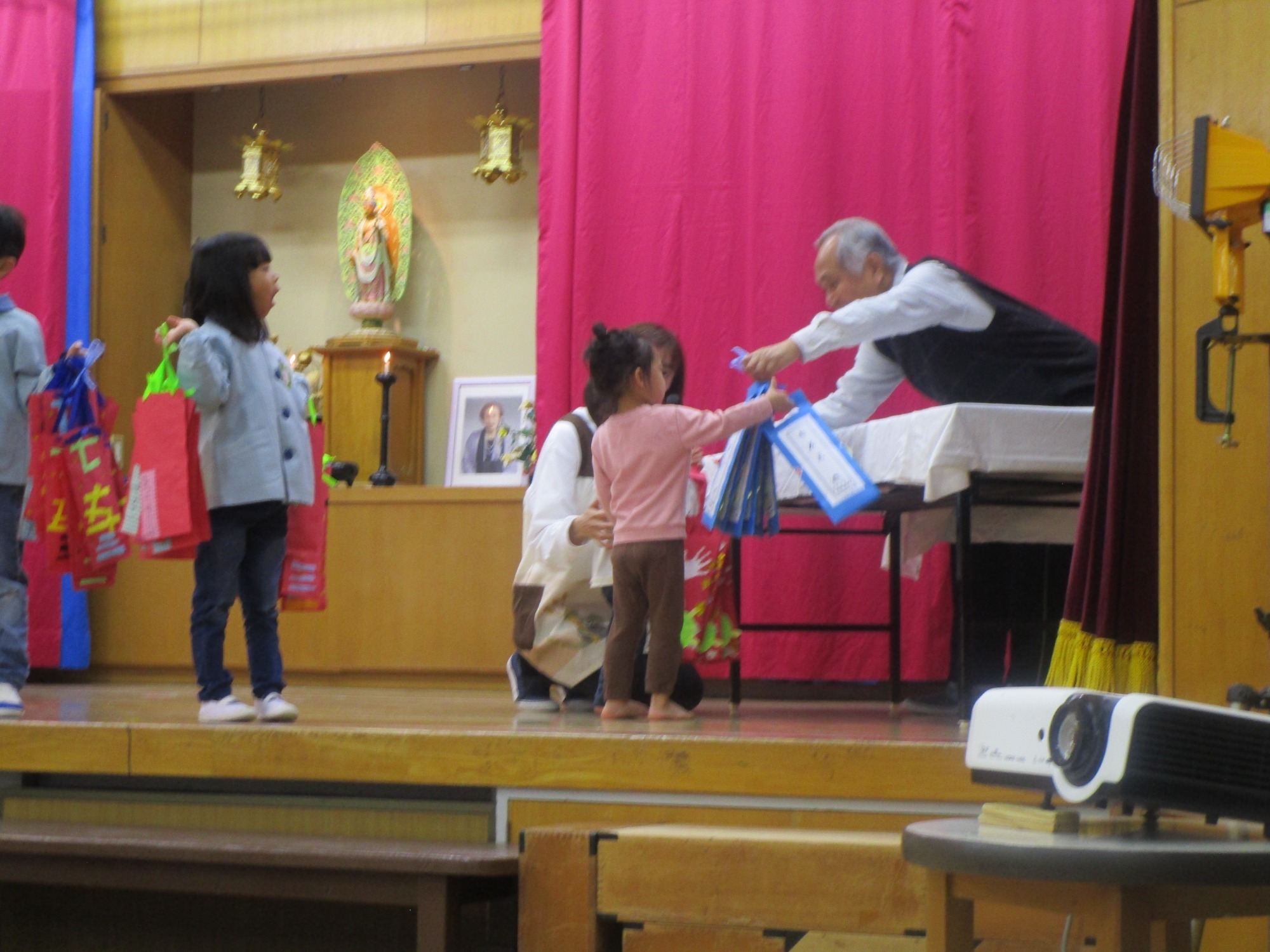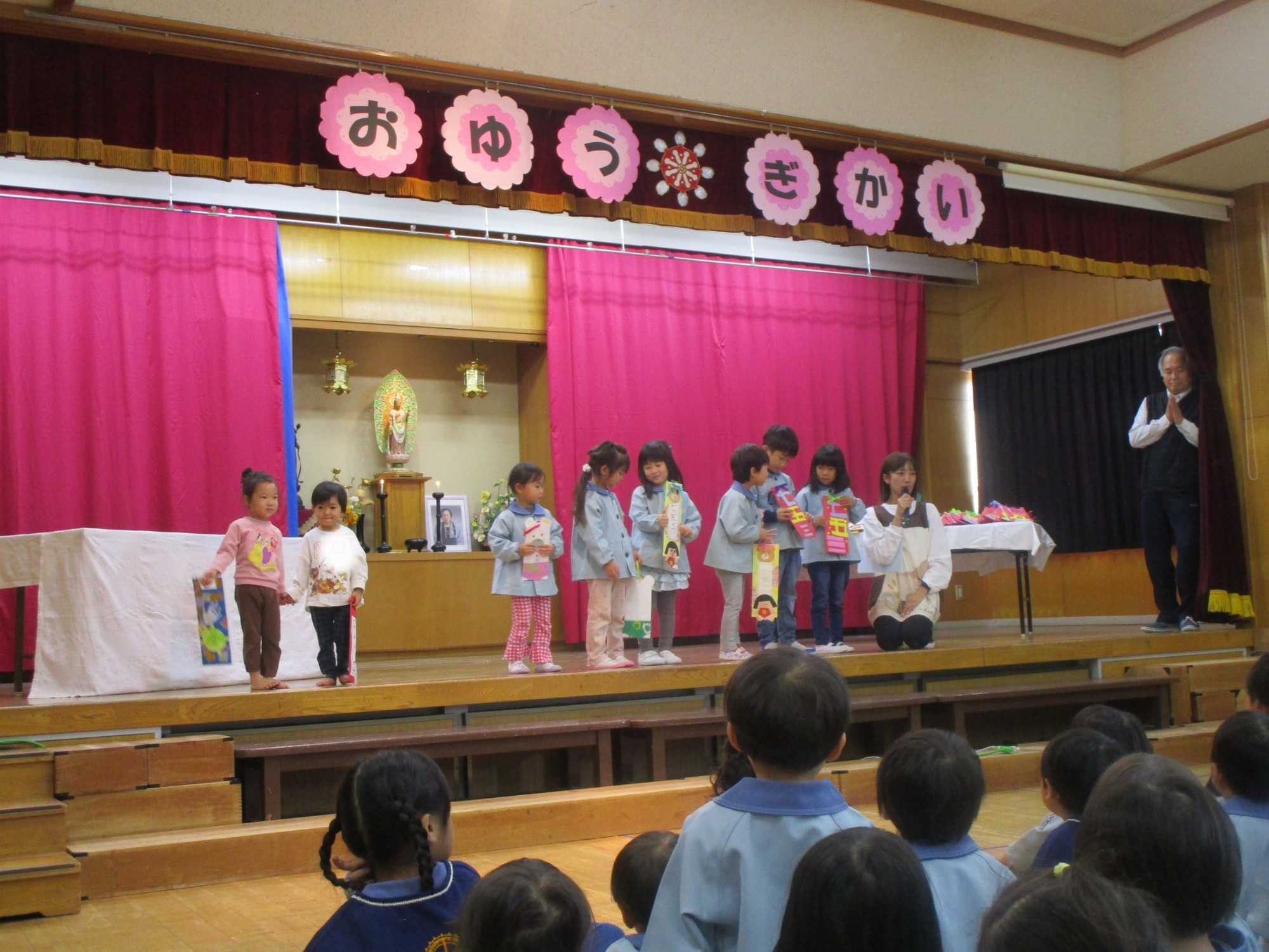 代表のお友だちがステージに上がり、園長先生から千歳飴を頂きました😊