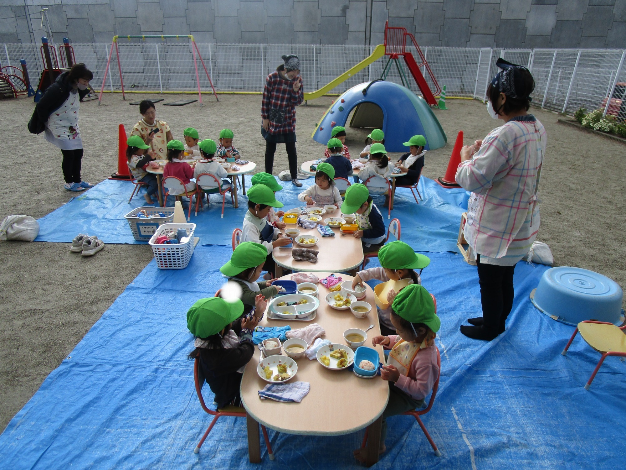 その後は2歳児は幼稚園の園庭で年中さんと一緒に遊び、0・1歳児はお芋の活動を楽しみました🍠