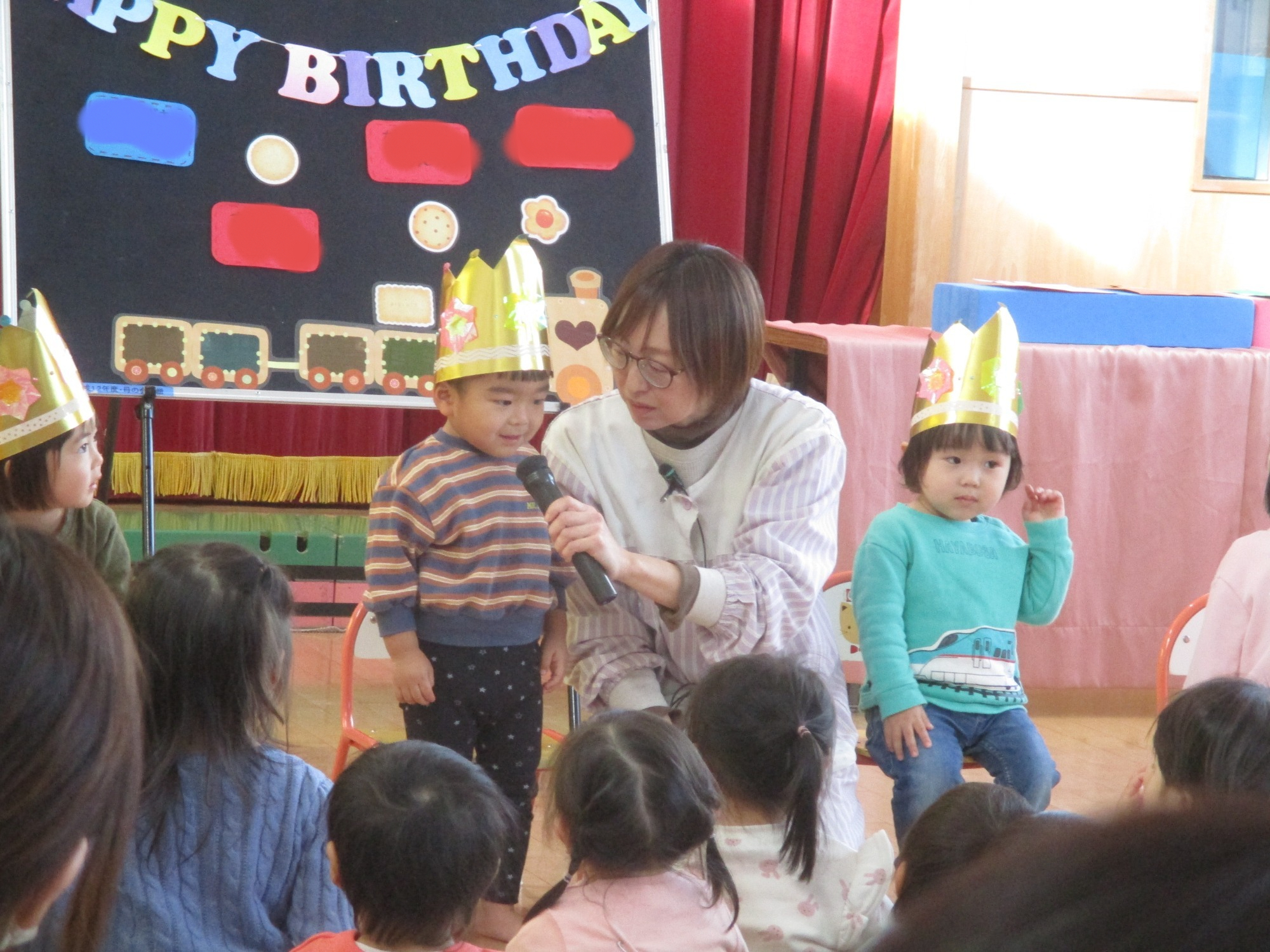 はじめに誕生児のお友だちにインタビュー✨その後は誕生カードや歌のプレゼントして楽しくお祝いしました😊