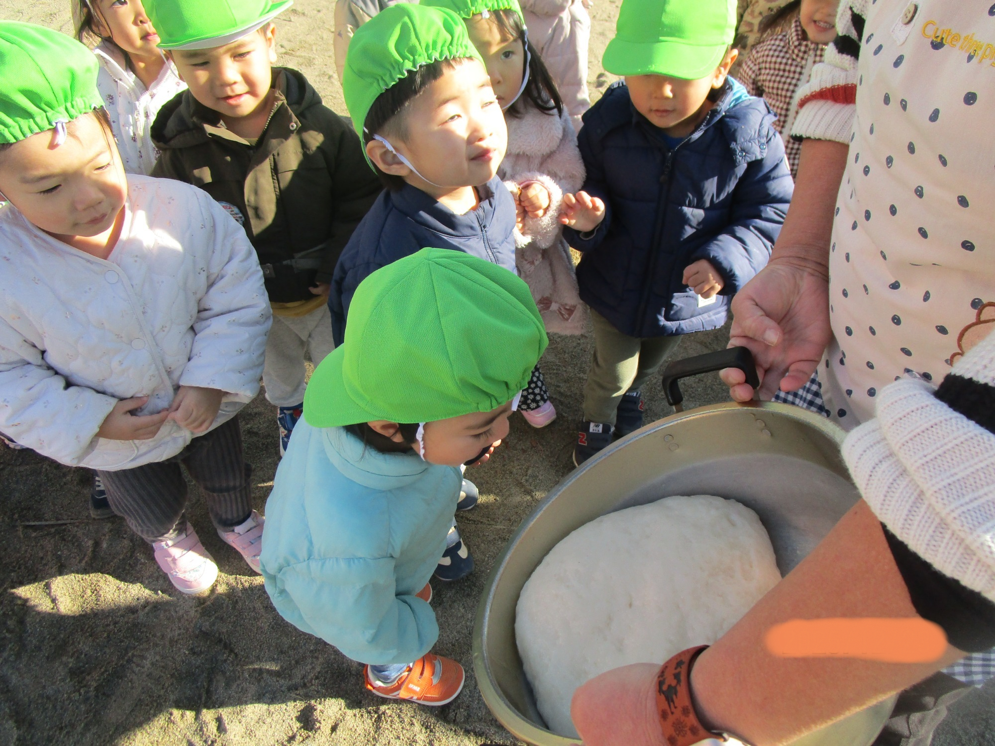お餅をつく姿をじー👀っと見ていた子どもたちです。