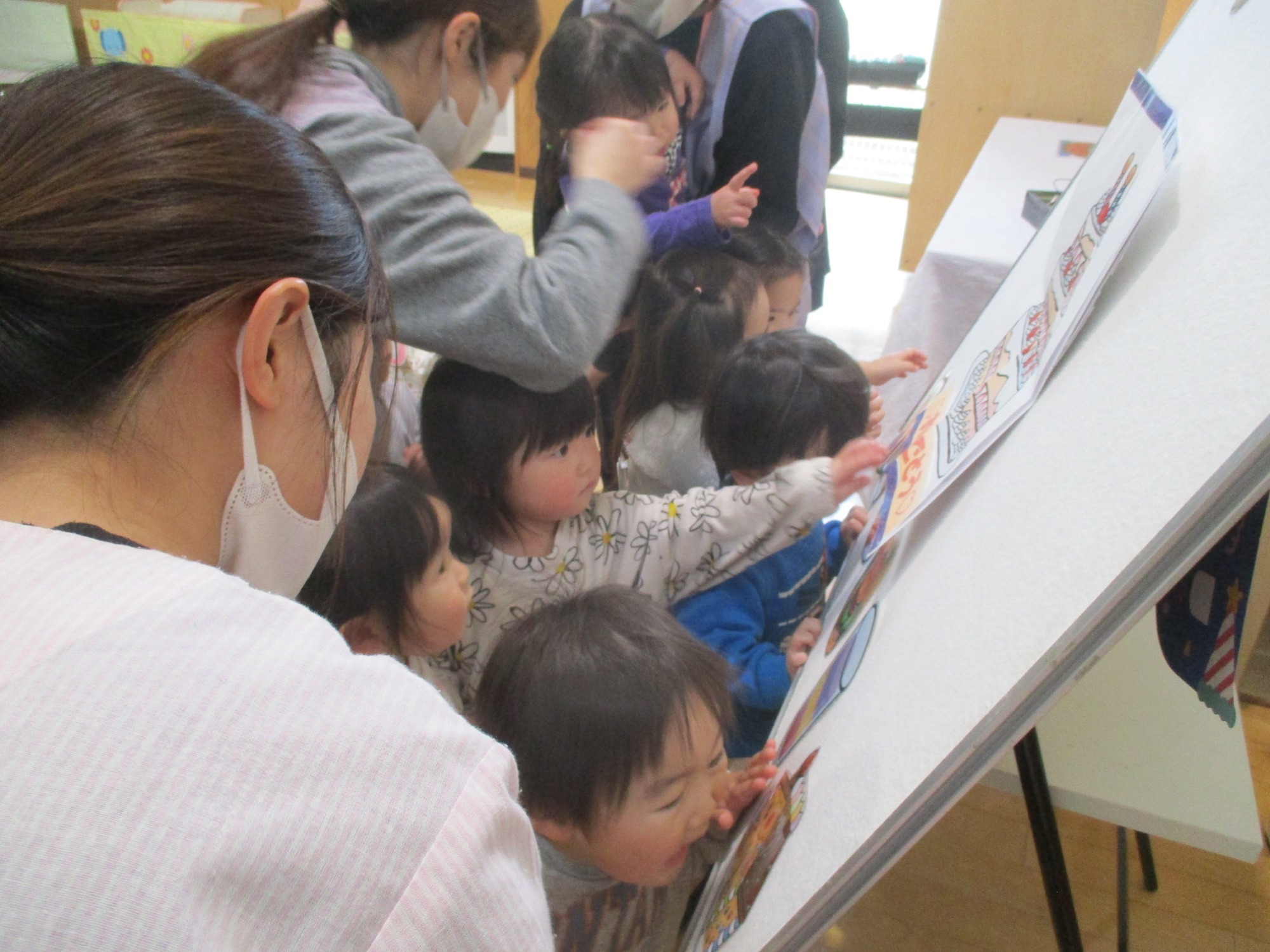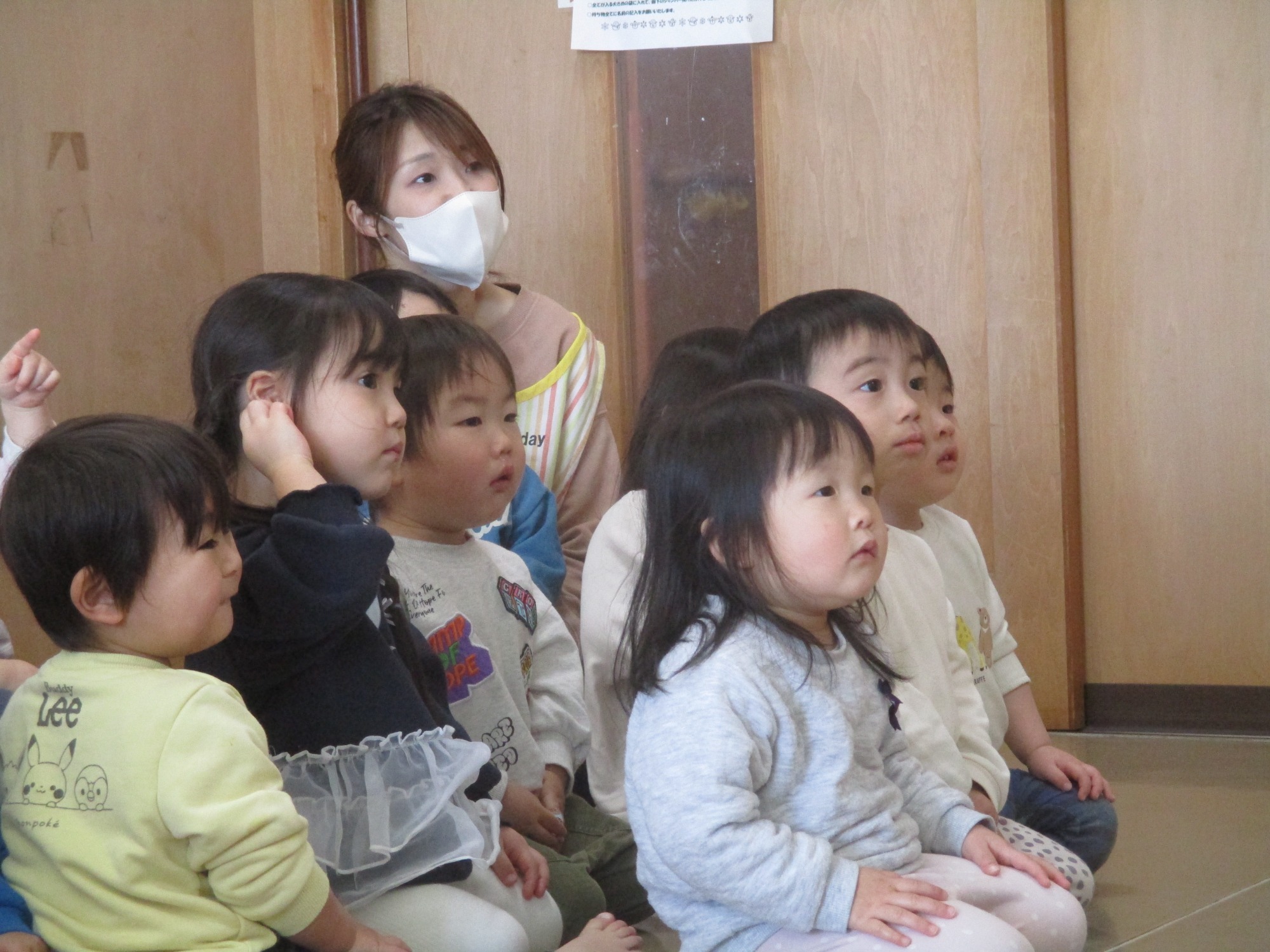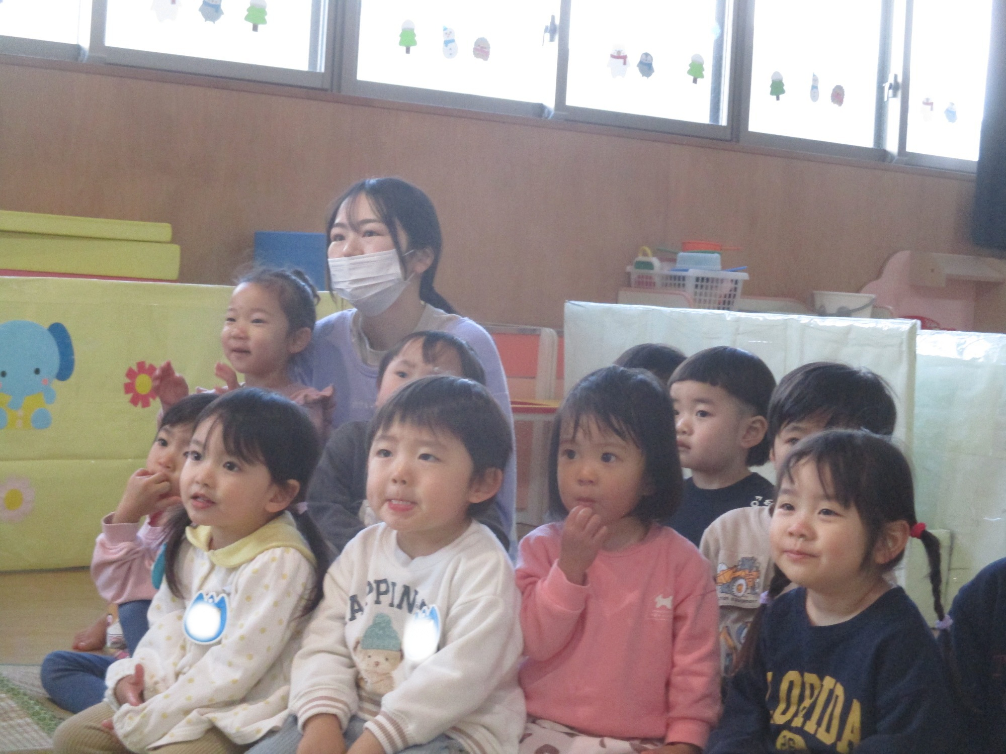 お楽しみで園の紹介をすると、興味津々に見たり、保育士の問いかけには喜んで答える子どもたちでした🎵