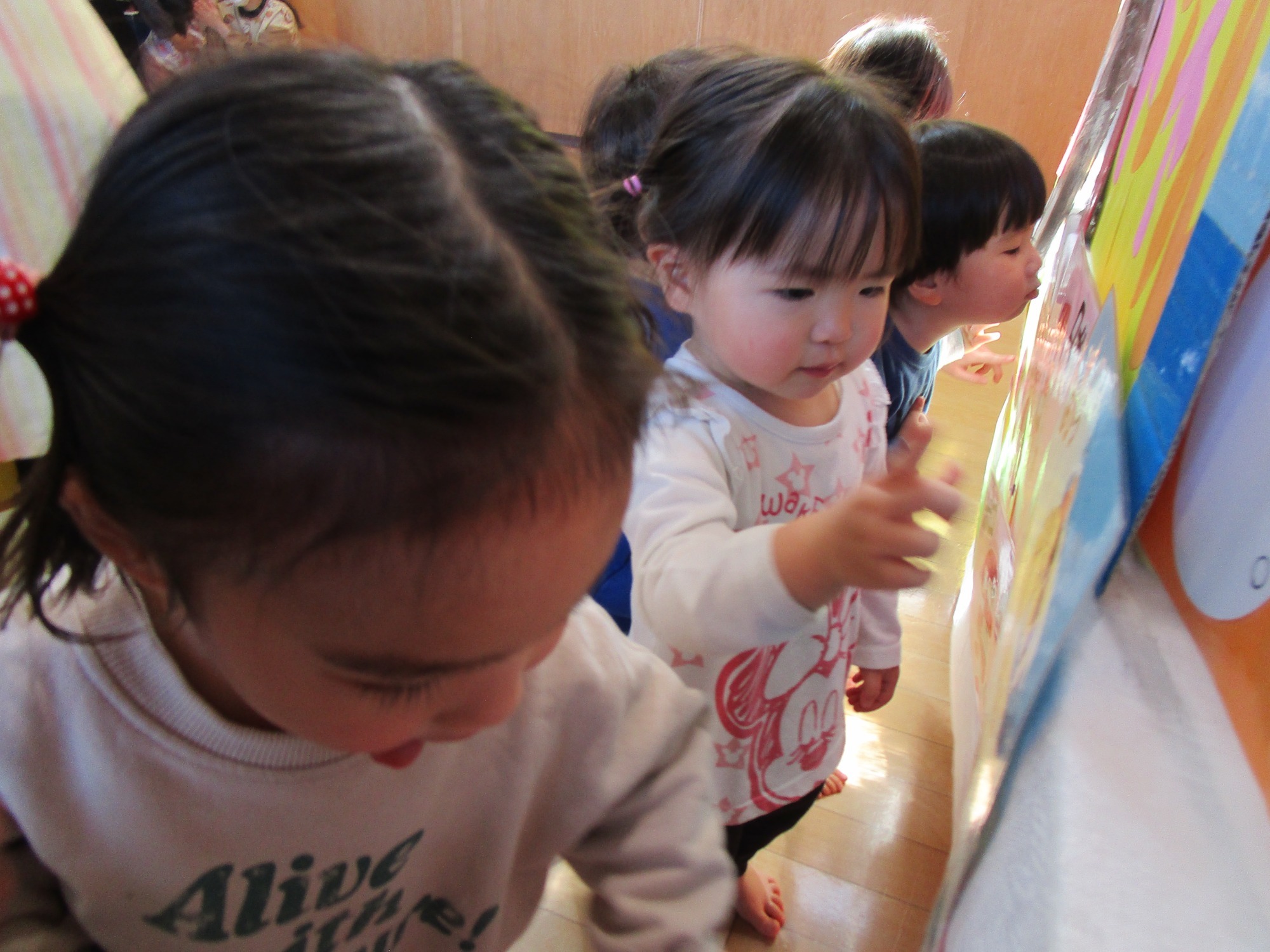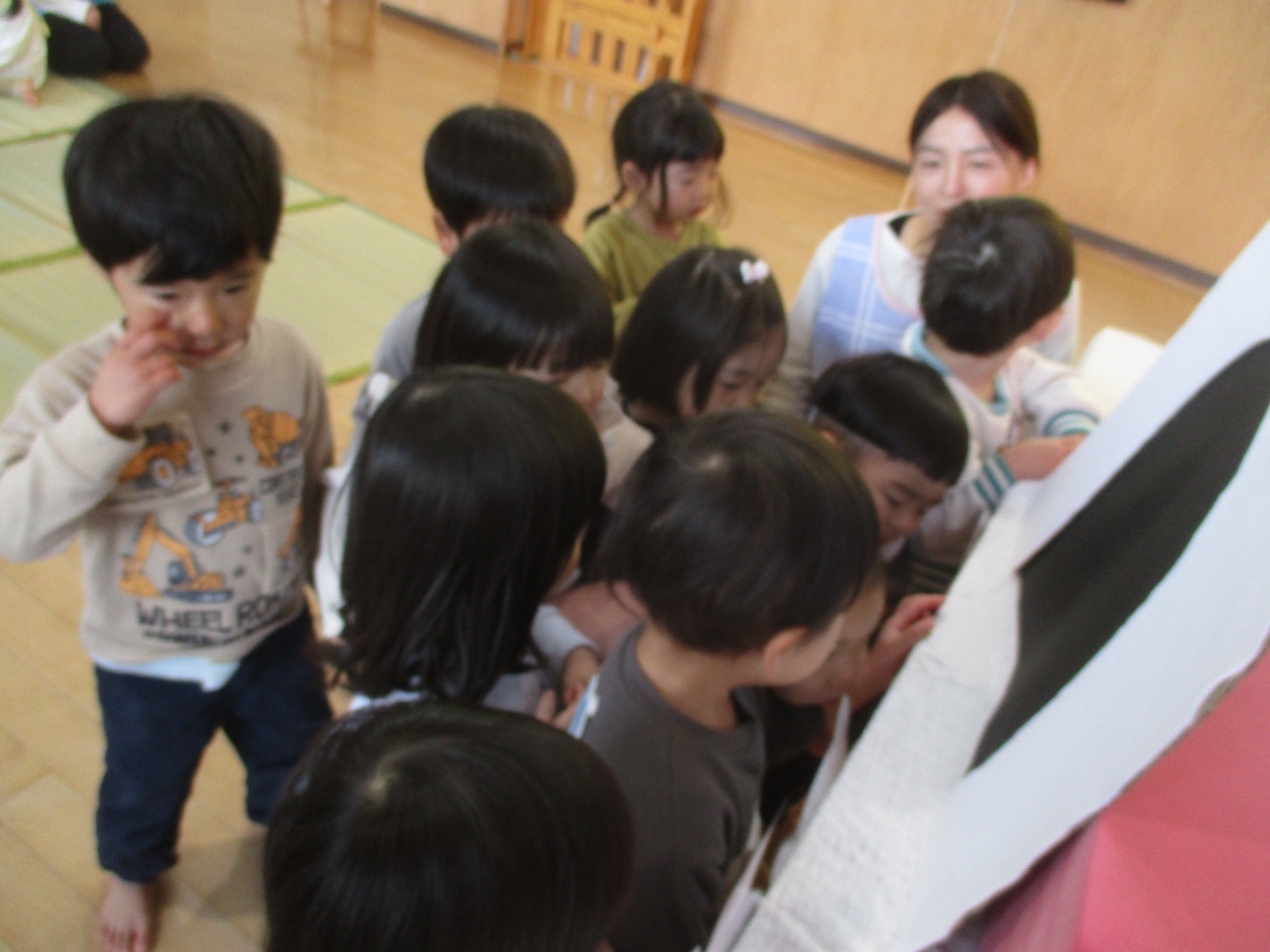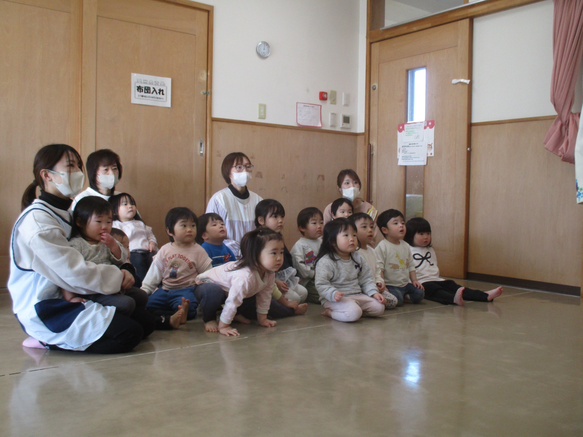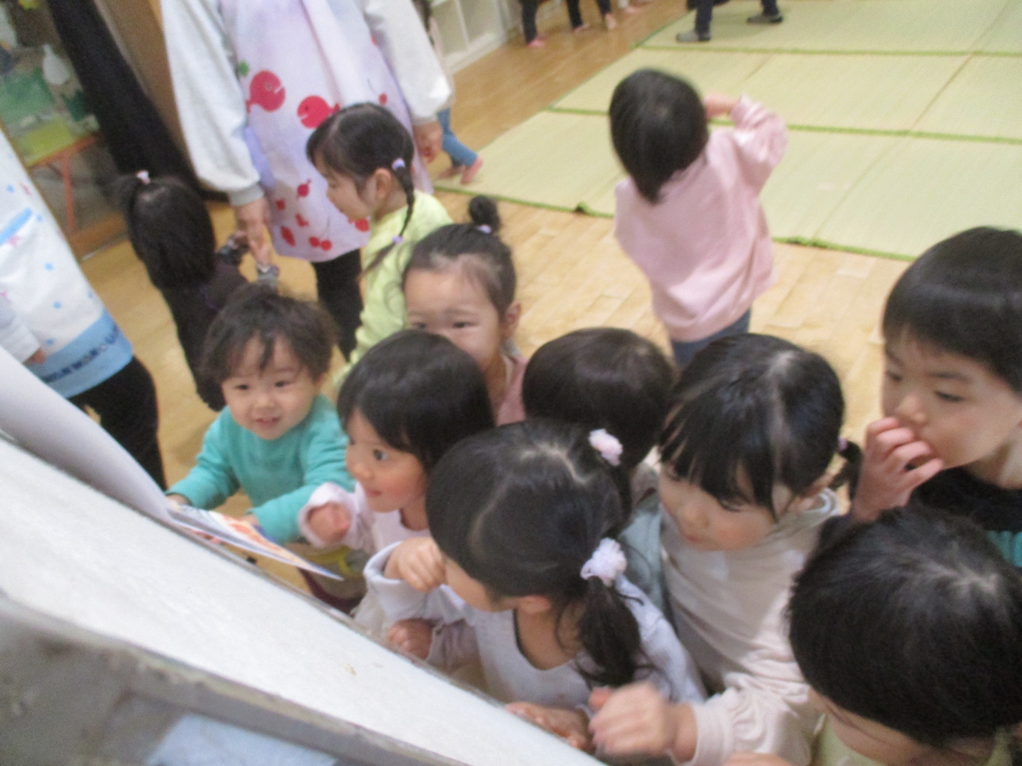 お楽しみで園の紹介をすると、興味津々に見たり、保育士の問いかけには喜んで答える子どもたちでした🎵