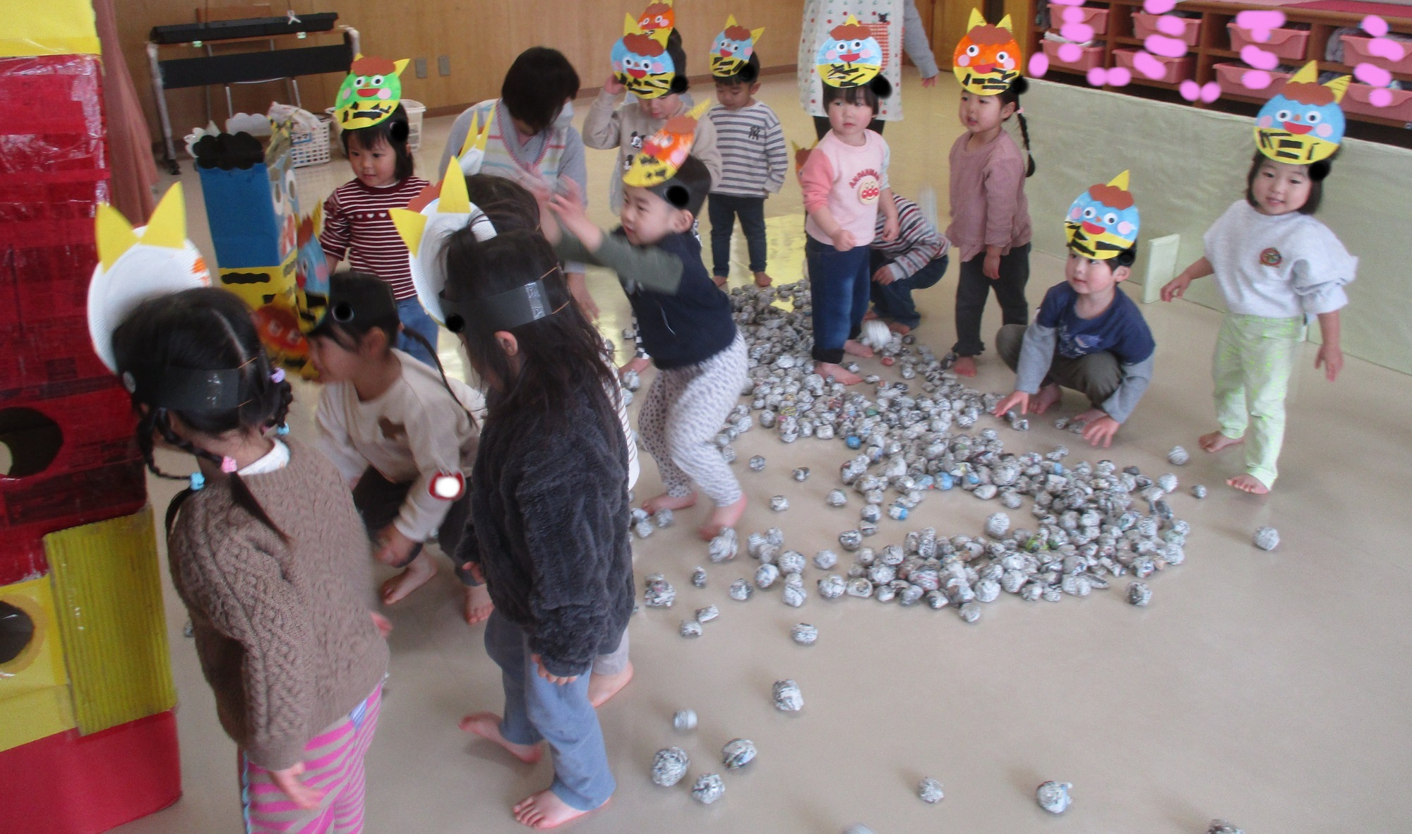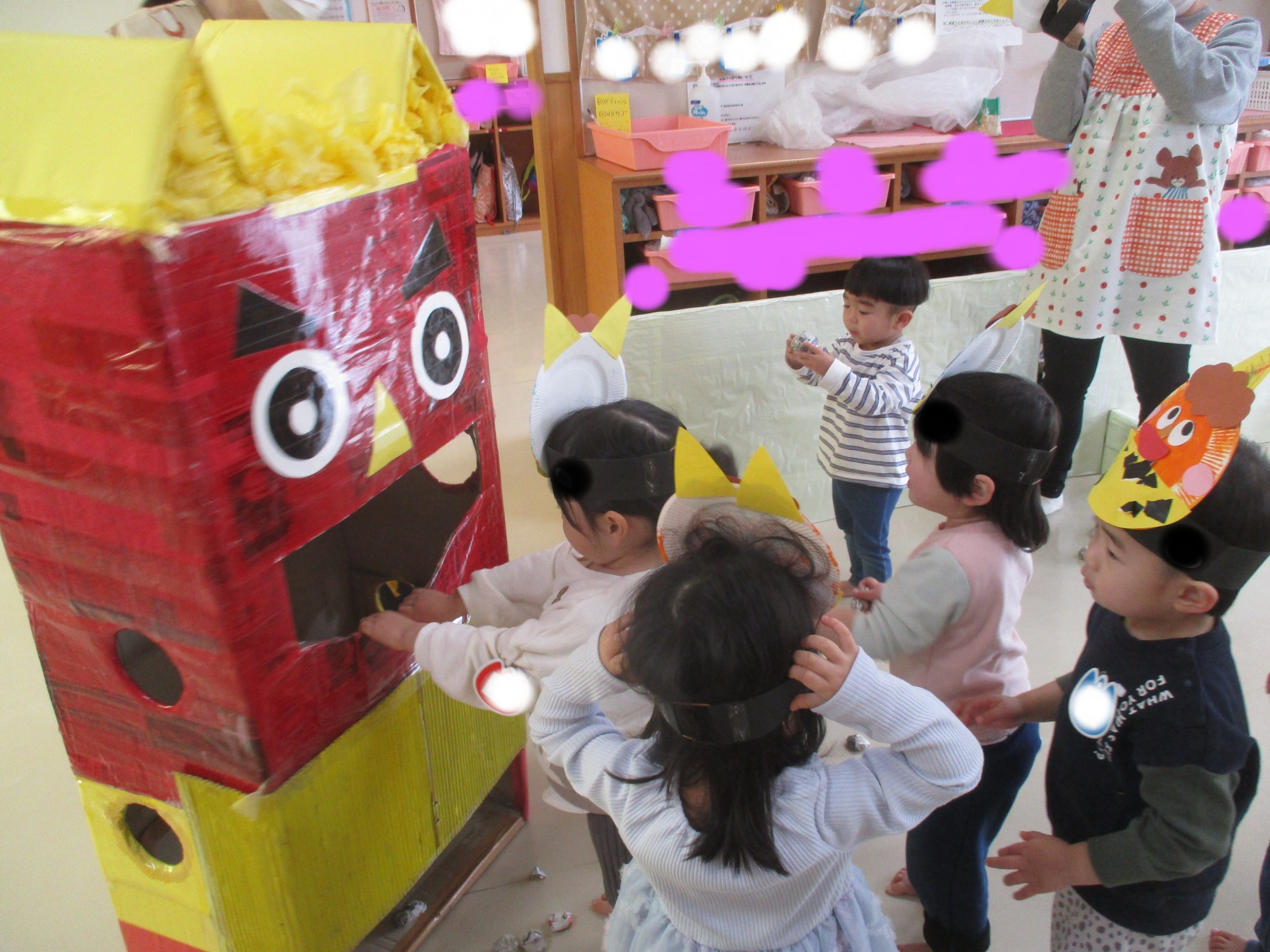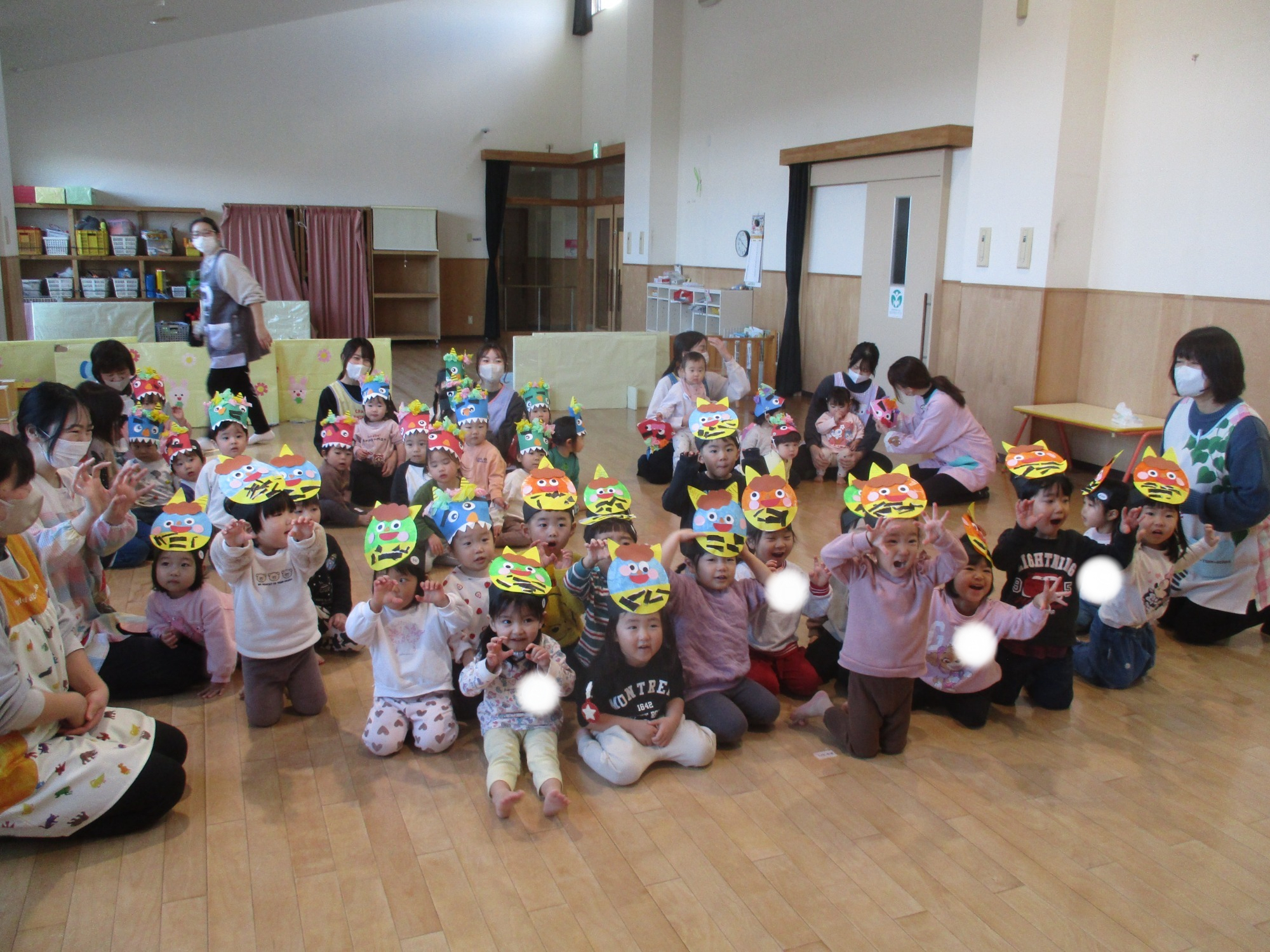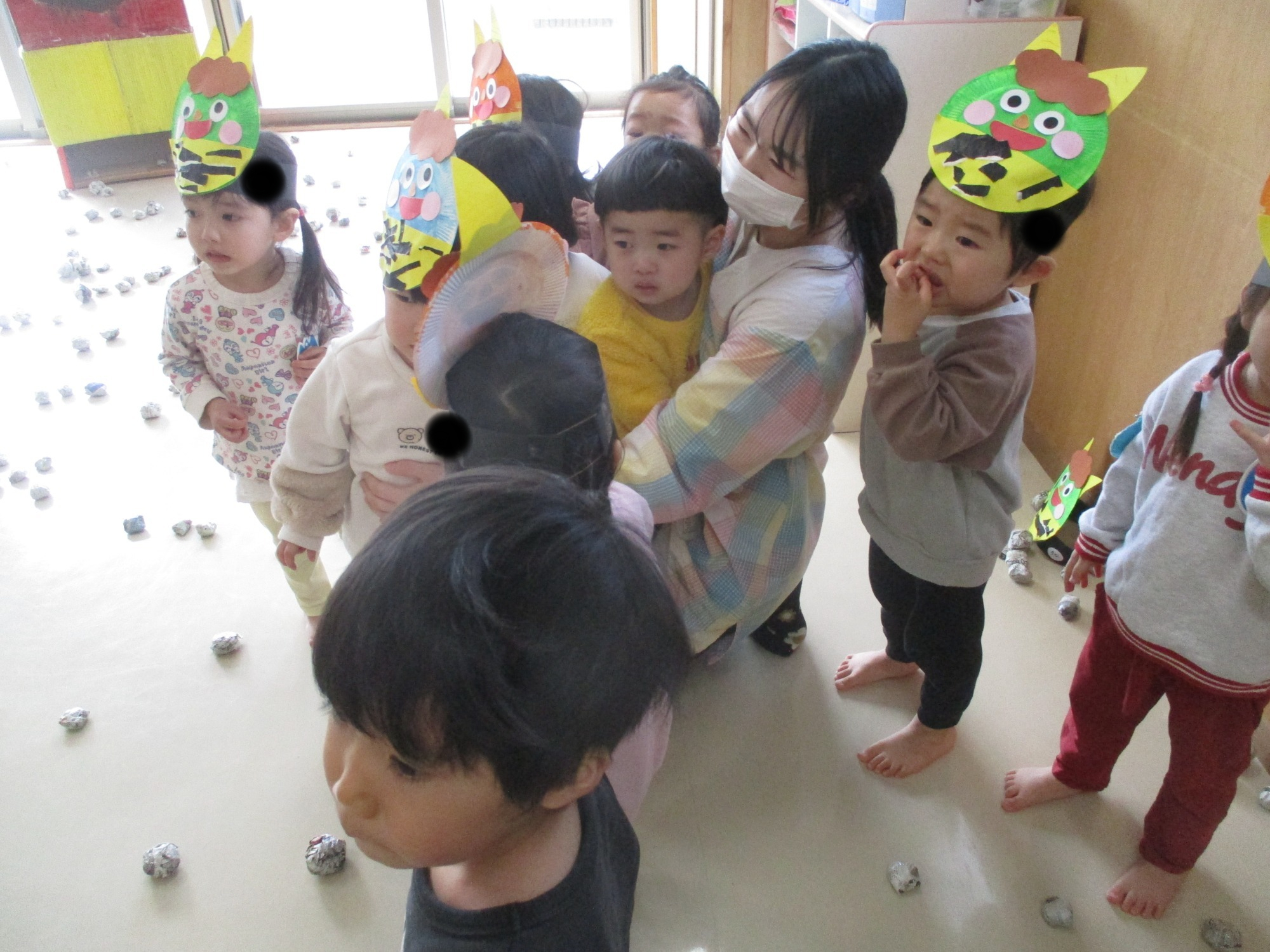 「鬼は外~福は内~!」と自分が作ったお面をかぶって豆まきを楽しみました🎵