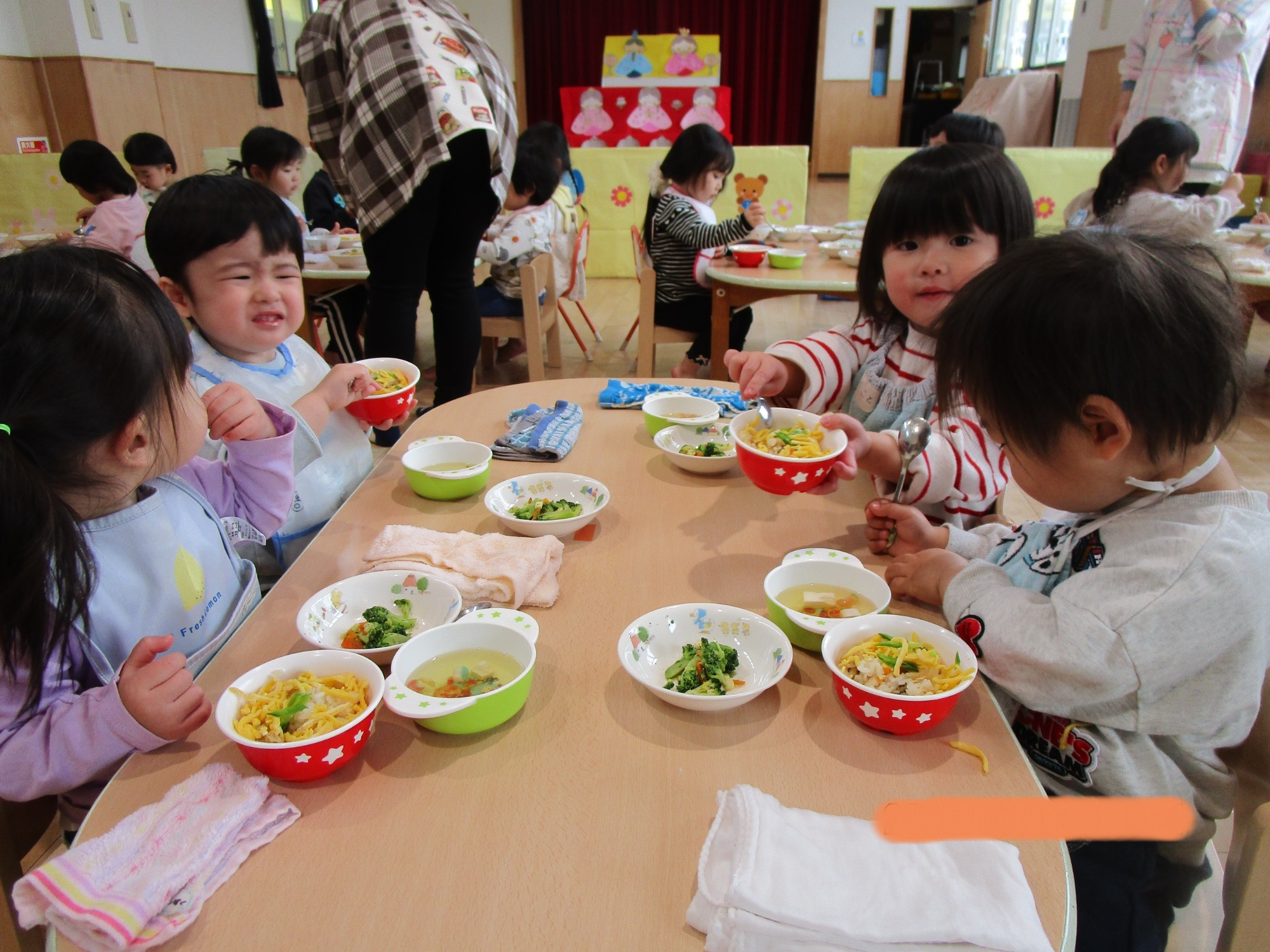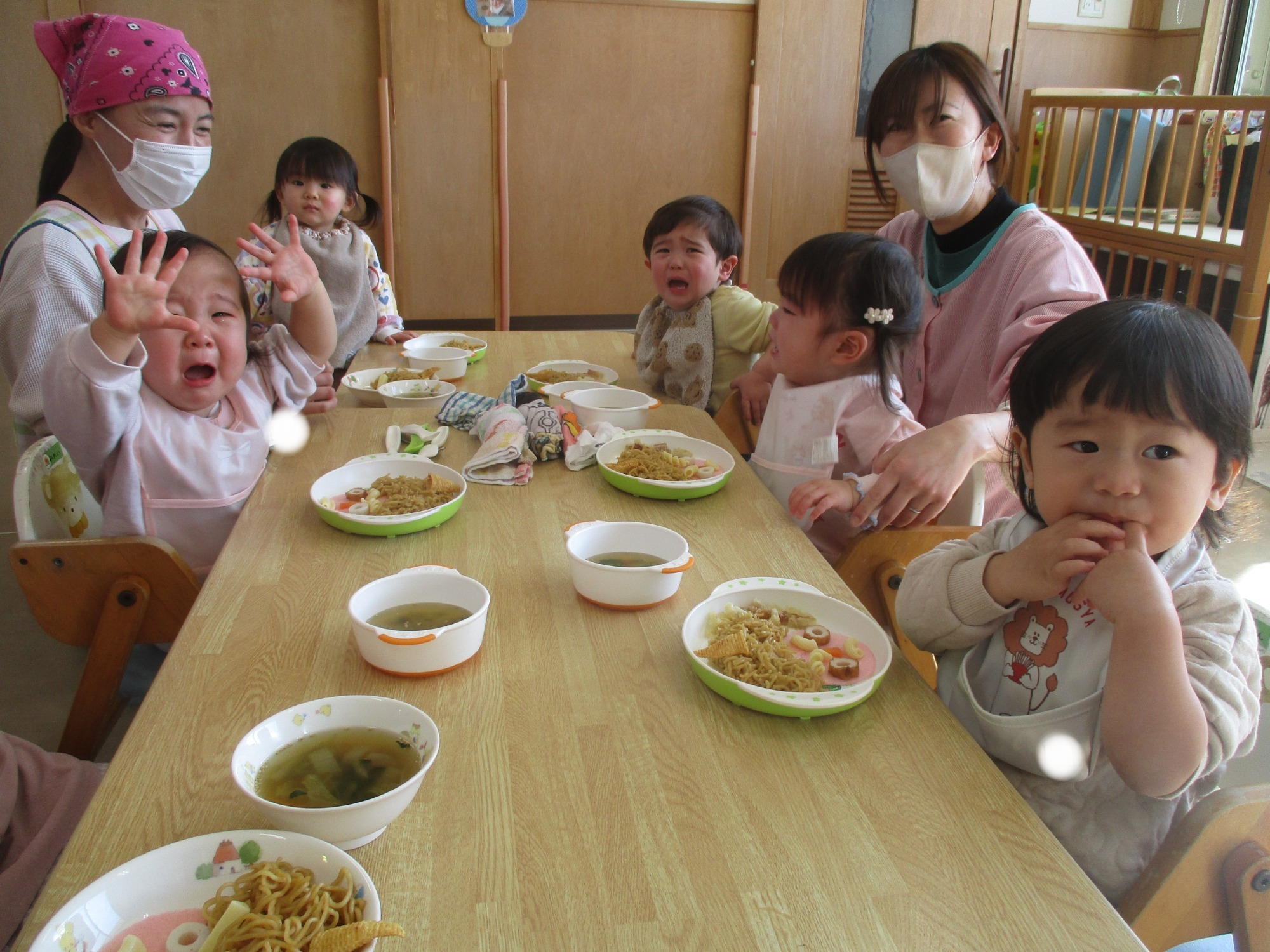 鬼の顔を見て少し驚いた0歳児。1,2歳児は「かわいいね💗」と嬉しそうに食べていましたよ😊