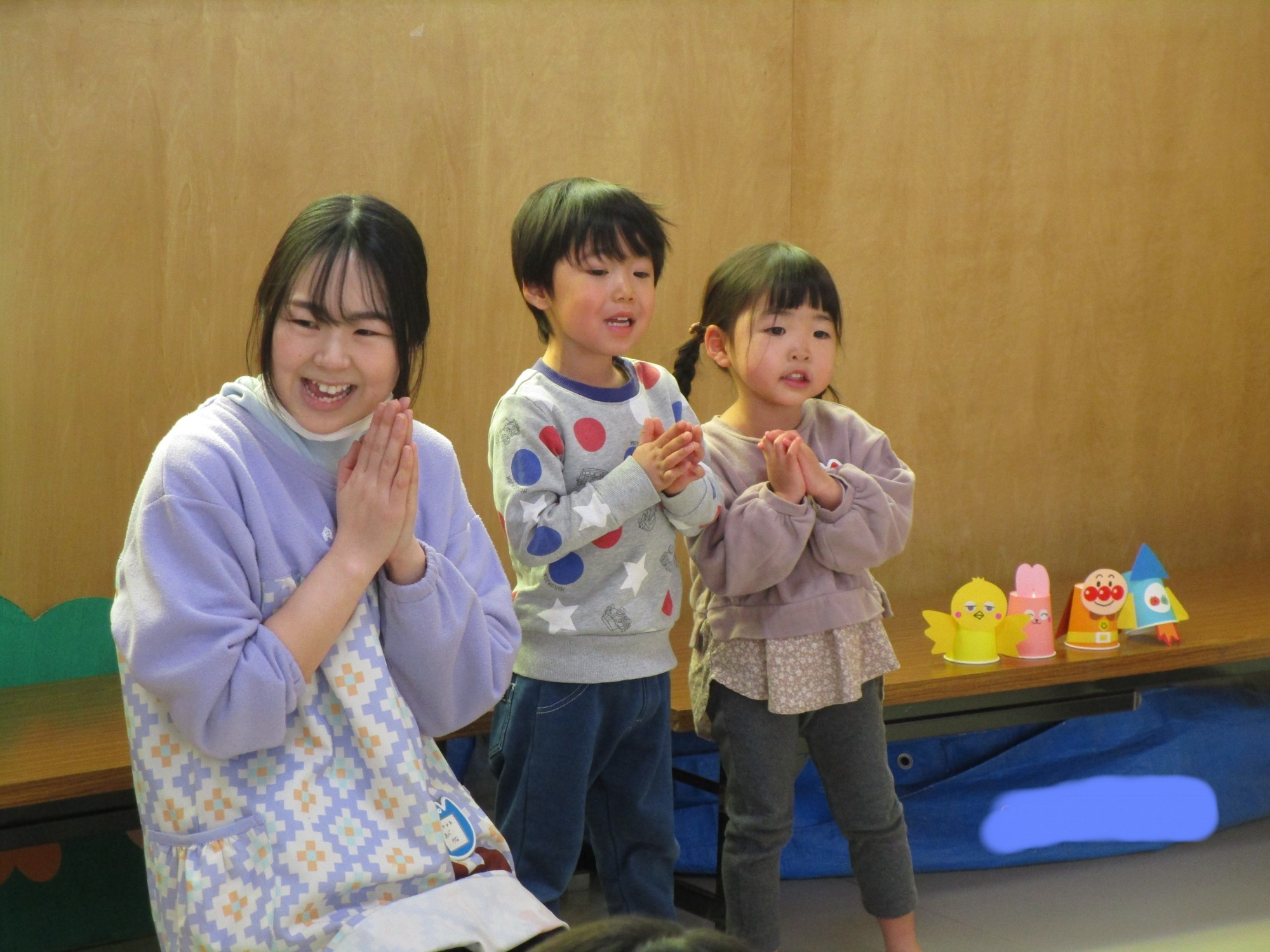 お楽しみは、キャベツの中からの歌に合わせたペープサートや担任紹介でした💛