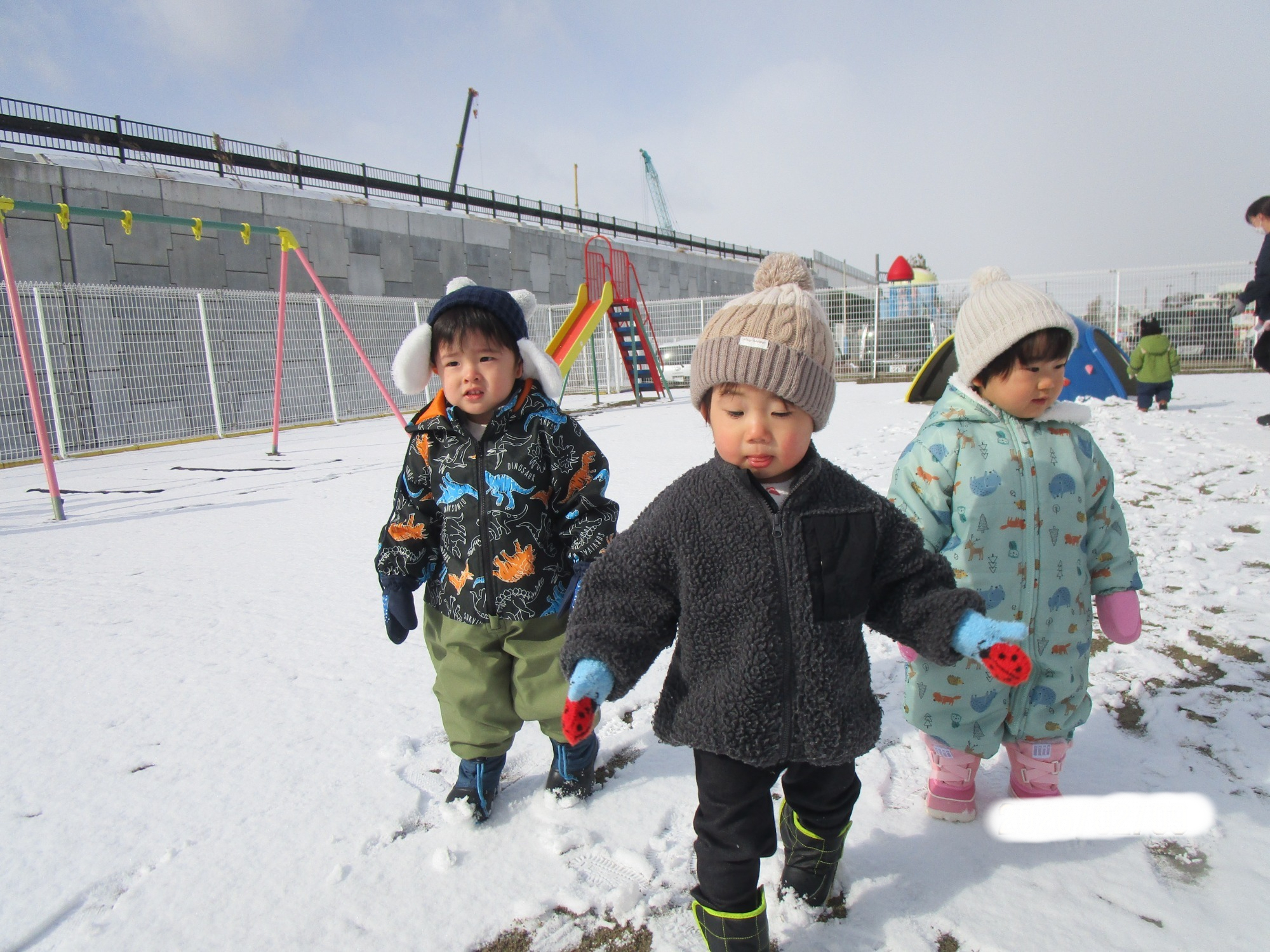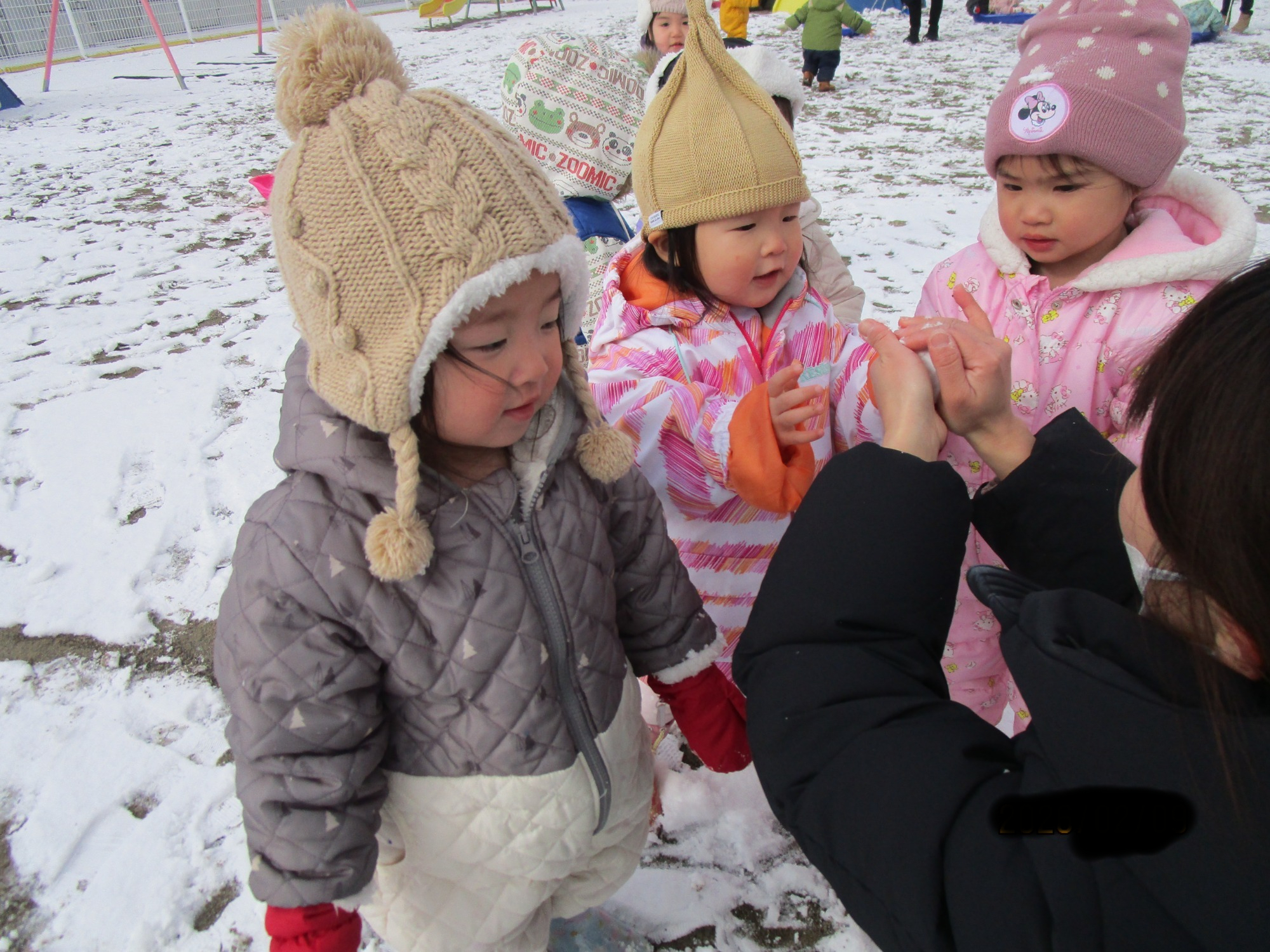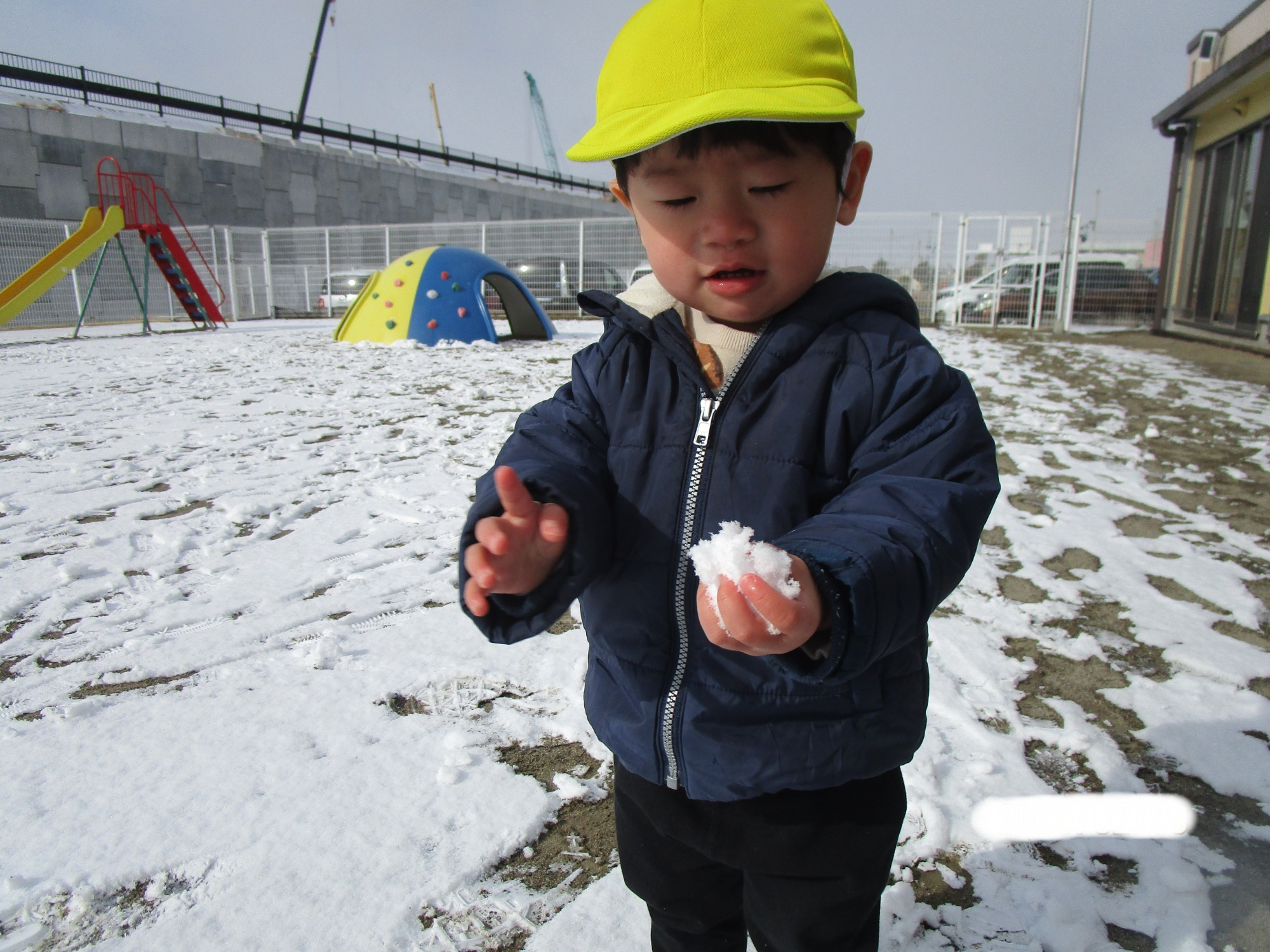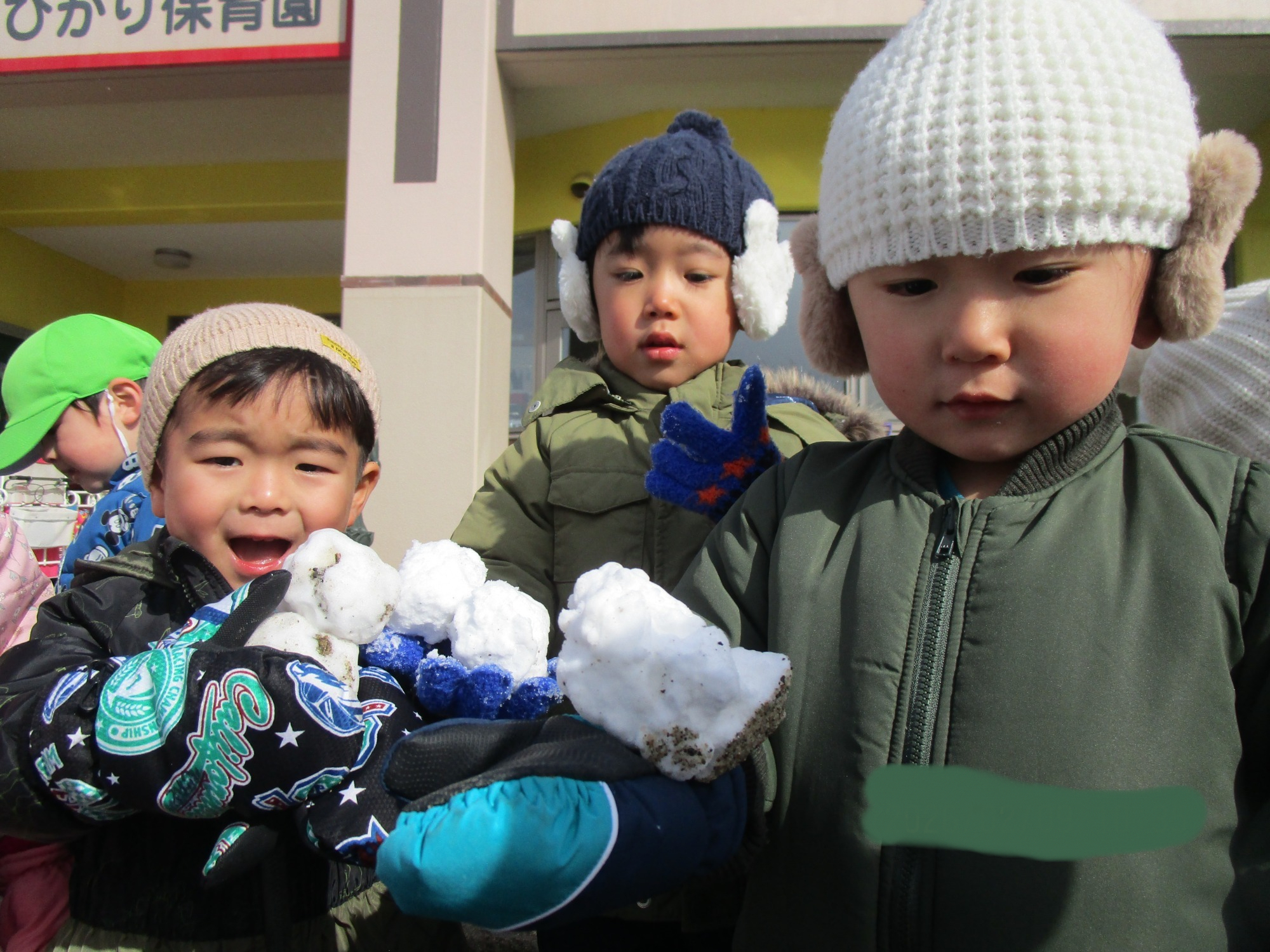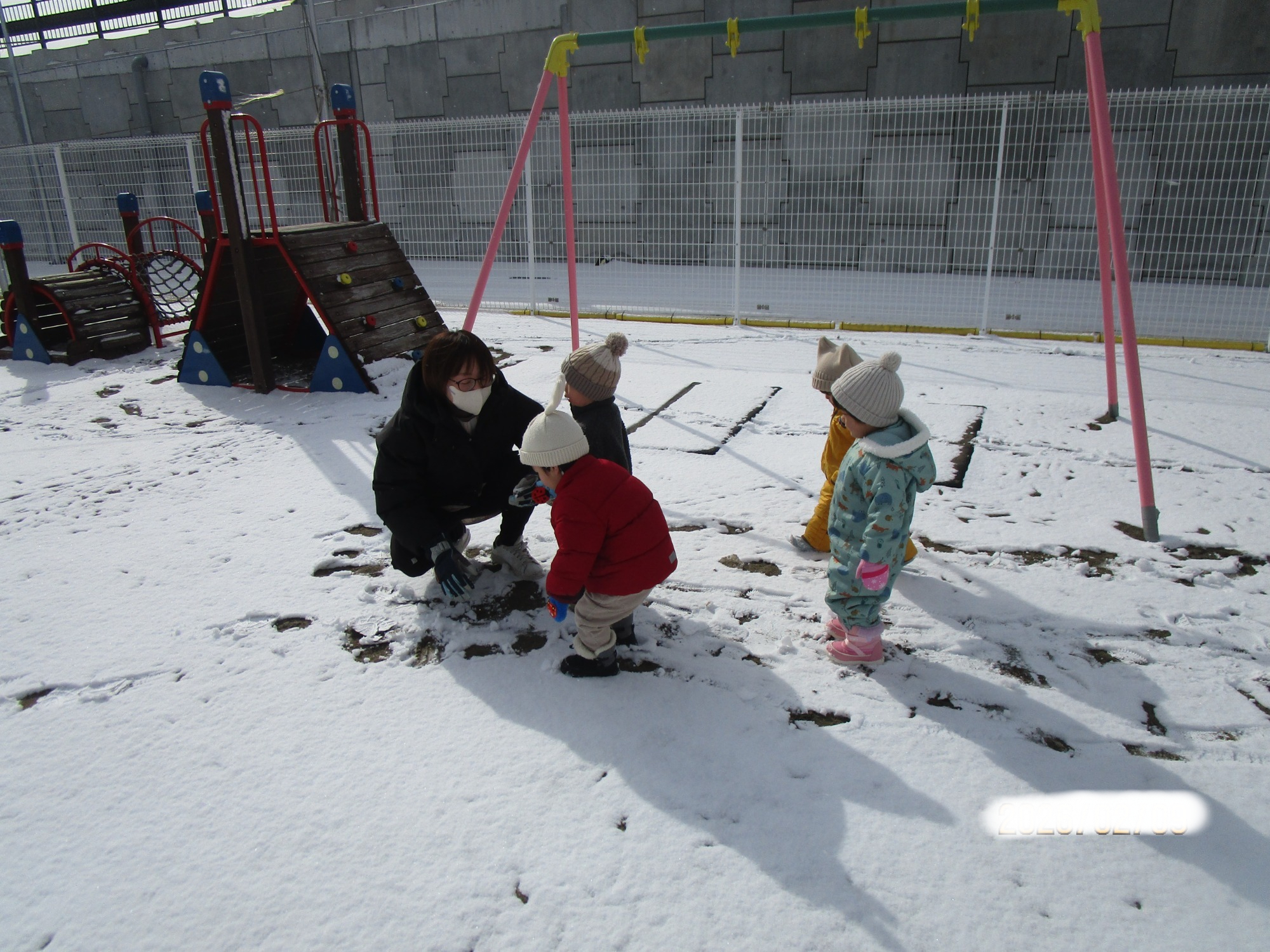 今シーズンは雪が少なく、なかなか雪遊びができませんでしたが、園庭に薄っすらと積もった雪を見つけると子どもたちは大興奮👀!