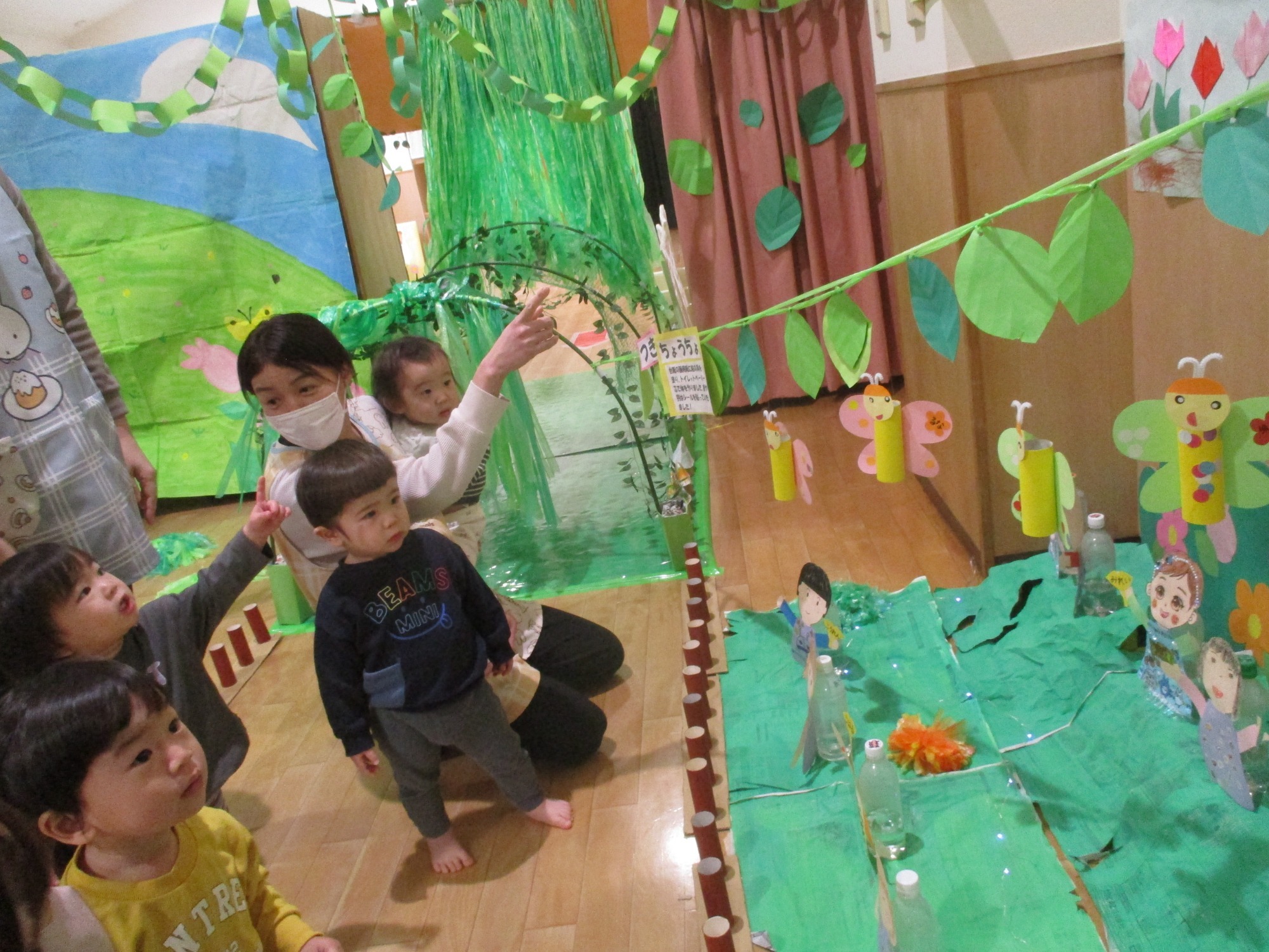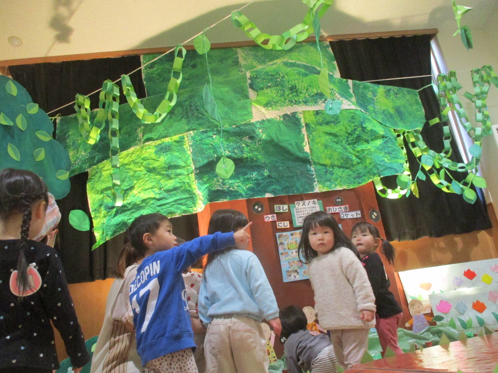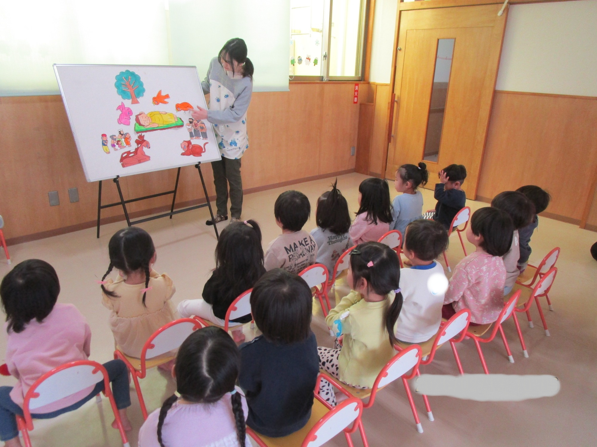 はじめに、さんぽの歌に合わせたパネルシアターが出てくると、一緒に歌をうたったり手を振りながら楽しんで見る子どもたちでした🎵