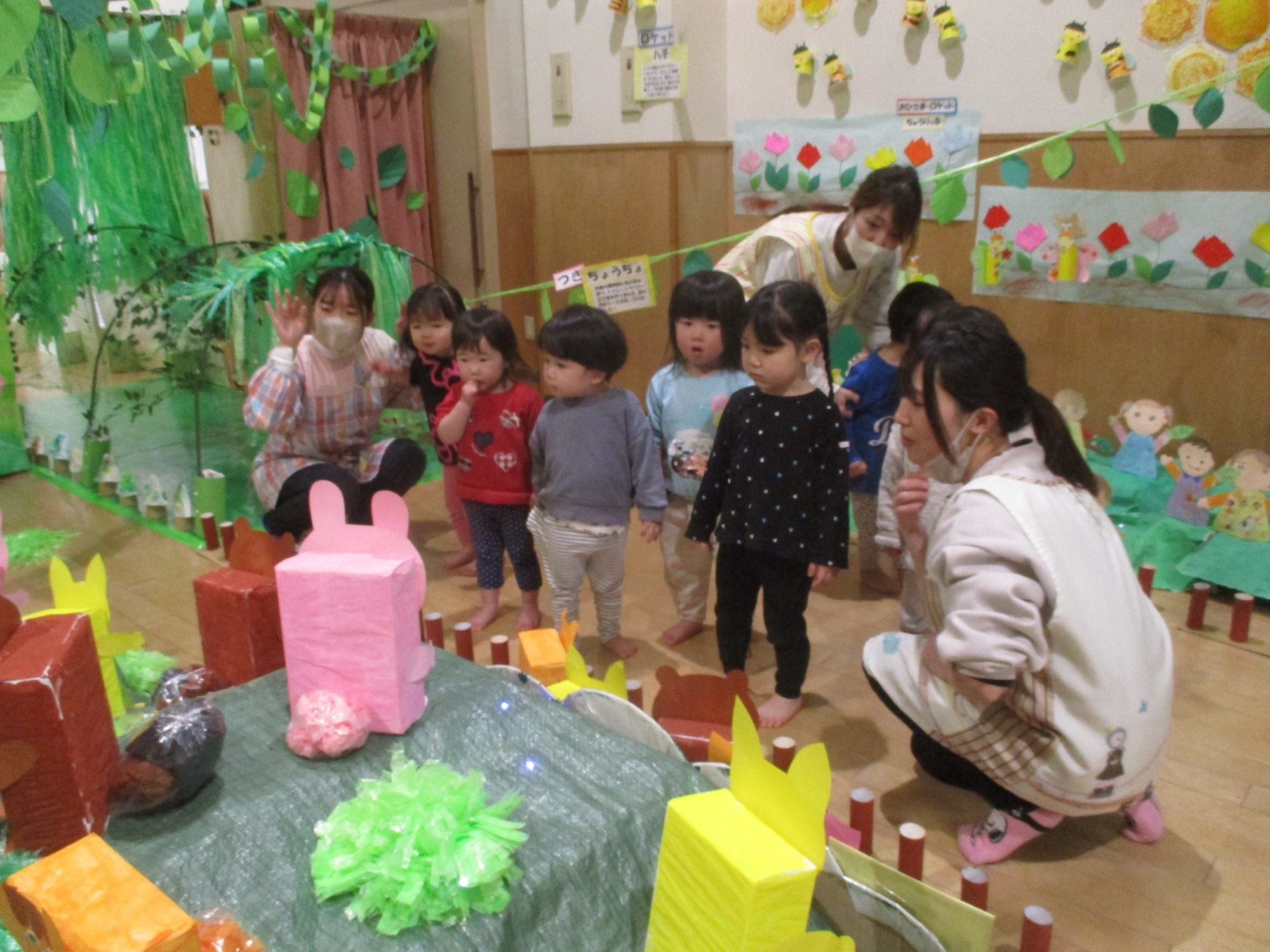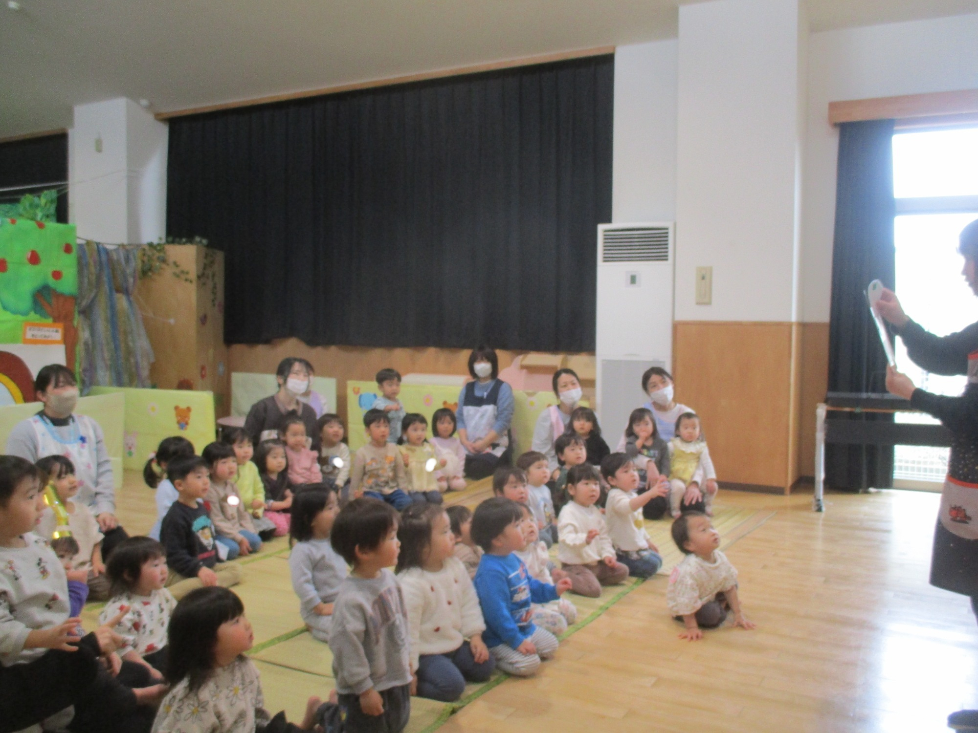 その後ろから、サル🐵やウサギ🐰など色々な動物たちが次々に現れ、子どもたちは目を輝かせて見入っていましたよ😊
