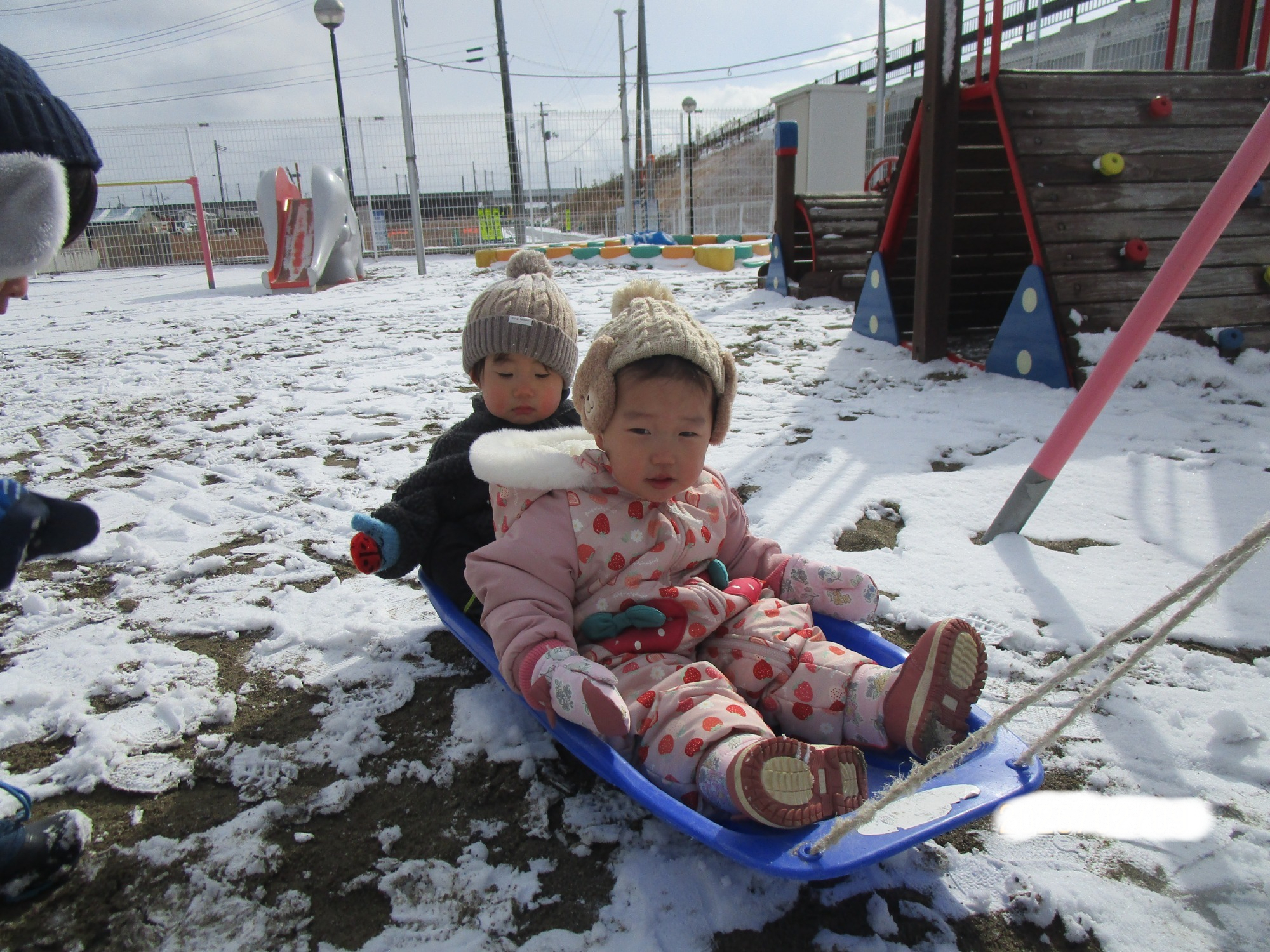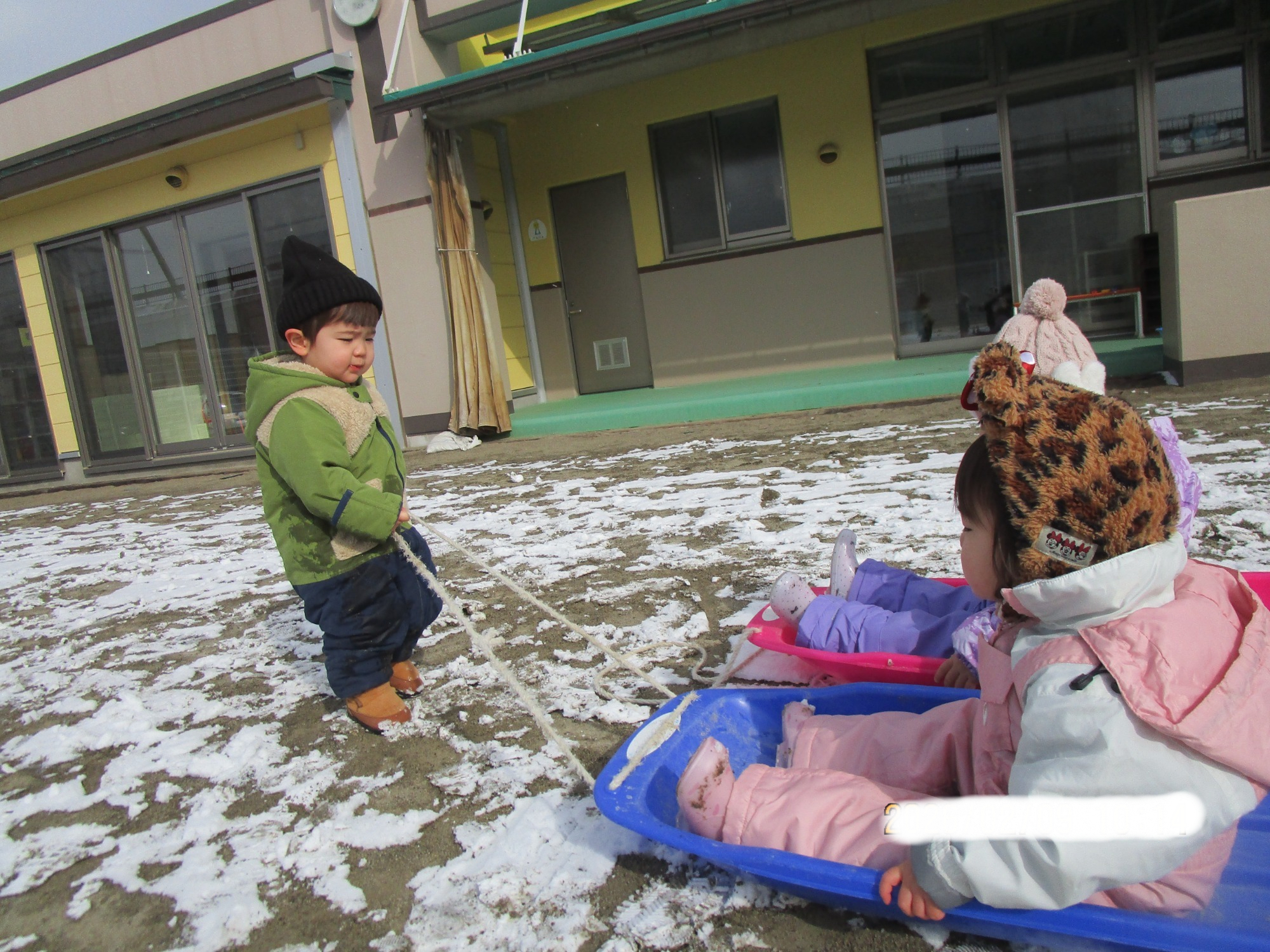 そりに乗ってお友だちや先生に引っ張ってもらい、笑顔いっぱいでした😊